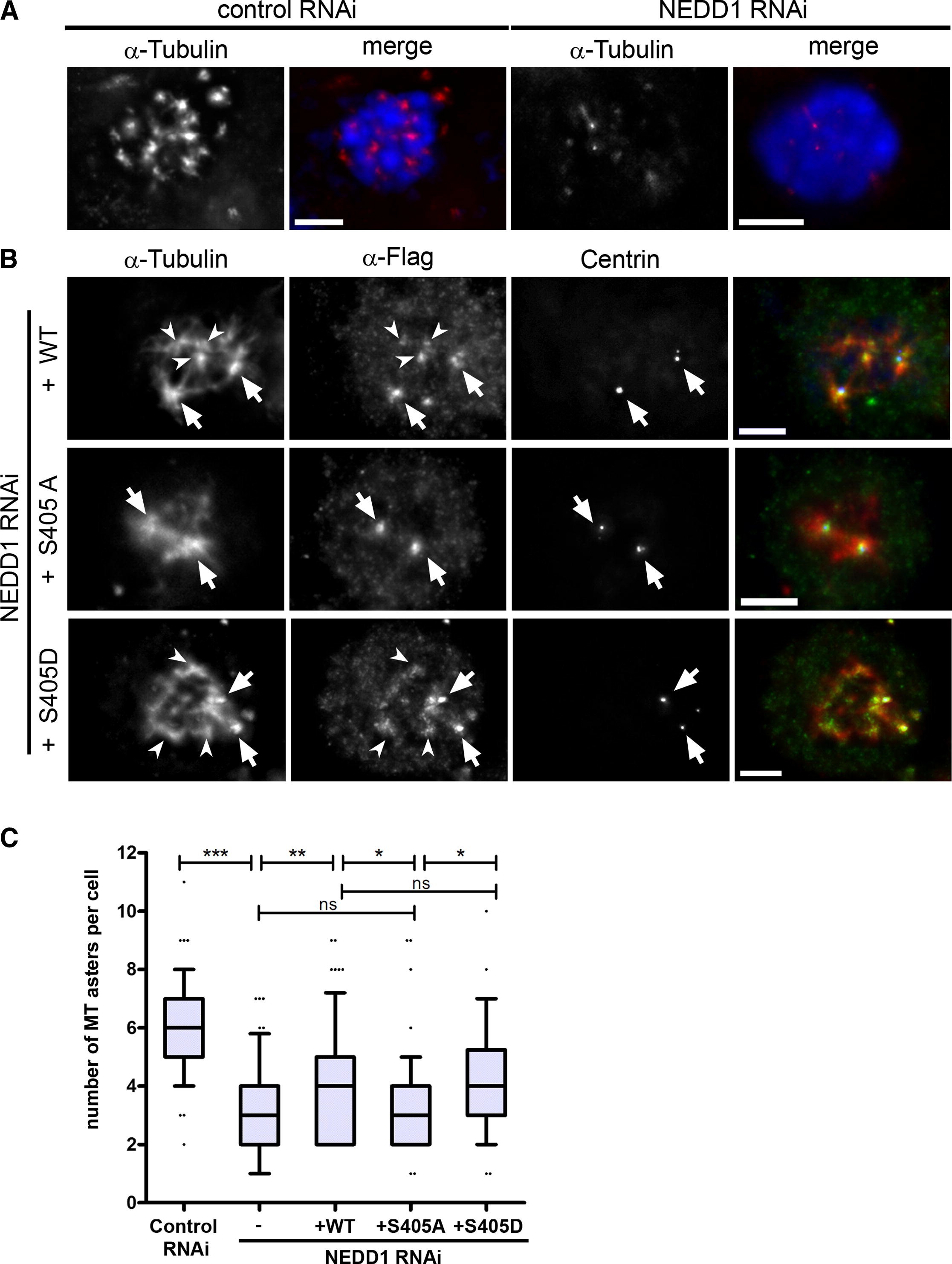 Figure 3. NEDD1 Phosphorylation at Ser405 Is Essential for Chromosome-Dependent MT Nucleation(A) Immunofluorescence images of control and NEDD1-silenced HeLa cells incubated in nocodazole and fixed 5 min after washout. NEDD1-silenced cells are strongly impaired for MT regrowth. In the merge, MTs are in red and DNA is in blue. Scale bar represents 5 μm.(B) Immunofluorescence images of NEDD1-silenced HeLa cells expressing RNAi-resistant Flag-hNEDD1 (+WT), Flag-hNEDD1 S405A (+S405A), or Flag-hNEDD1 S405D (+S405D) incubated in nocodazole and fixed 5 min after washout. The centrosomes (indicated by arrows) are visualized by GFP-centrin (here shown in blue) stably expressed in this HeLa cell line. The recombinant proteins are detected with anti-Flag antibodies (displayed in green), and tubulin is shown in red. Chromosomal MTs marked with arrowheads are absent in cells expressing Flag-hNEDD1 S405A. Scale bar represents 5 μm.(C) Quantification of the number of MT asters per cell, 5 min after nocodazole washout. In the box-and-whiskers plot, boxes show the upper and lower quartiles (25%5%) with a line at the median, whiskers extend from the 10th to the 90th percentile, and dots correspond to outliers. ∗p ≤ 0.05; ∗∗p ≤ 0.01; ∗∗∗p ≤ 0.005. The graph shows one representative experiment out of nine independent experiments (each with n ≥ 30).See also Figure S4.