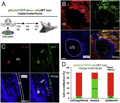 Figure 6. Analysis of Donor Cell Contribution in Limb Regenerates after (pHsβcatâGFP Donor)/(Wild-Type Host) Transplantations(A) Diagram of cell contribution analysis. Wild-type host frogs were transplanted with a βcatâ limb bud cell patch with Shh and FGF10 after amputation. Heat shock was given for the first 2 weeks to maintain βcatâ expression. Frogs were left without heat shock for 4 weeks, and heat shock was given 3 days before sample collection to activate GFP expression (fused to βcatâ) in donor cells. The red line indicates the level of sections shown in (B and C)(B and C) Detection of donor cells (green) in cartilage (B), muscle (red, with 12/101 antibody staining, B and C) and epidermis (C) in a regenerate illustrated as in (A), 45 dpa. m, muscle; c/b, cartilage or bone; and e, epidermis. Muscle tissues are shown in red as revealed by immunostaining with 12/101, a specific muscle marker, and labeled as m in the red channel images; cartilage and epidermis are outlined with white dotted lines in the blue channel images.(D) Quantification of donor and host cell contributions in limb regenerates from (pHsβcatâGFP donor)/(wild-type host) transplantations. Error bars, standard deviation; n = 9 animals.See also Figures S2 and S3. |