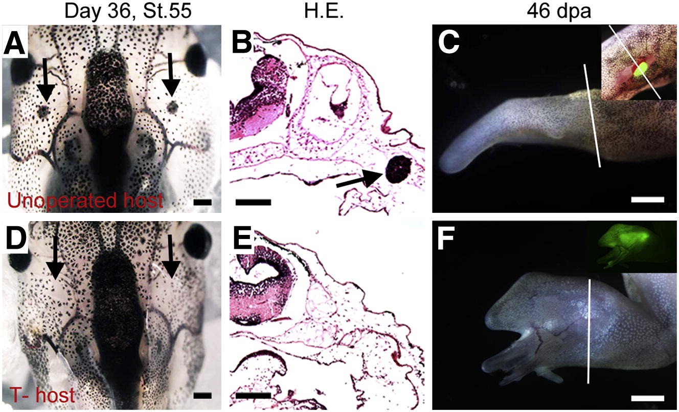 Figure 1. Thymectomy Is Necessary for Transplantation Experiments in Xenopus Frogs(A and B) The developing thymus in a control stage 55 tadpole, shown as in whole-mount animal (A) and on cross-section after hematoxylin and eosin staining (B). Black arrows indicate thymus.(C) Limb regeneration after transplantation of a GFP-labeled limb bud to a wild-type frog host. GFP is undetectable in the single spike regenerate, 46 days postamputation (dpa). Inset shows a green limb bud immediately after transplantation. Note the relative size of the donor and host.(D and E) Thymus is not regenerated in thymectomized (T-) host, as shown by the lack of thymus in whole-mount animal (arrows in D) and on cross-section after haematoxylin and eosin staining (E), 36 days after thymectomy.(F) Limb regeneration after transplantation of a GFP limb bud to thymectomized (T-) host. The graft has survived long term and generated a multidigit regenerate. Inset shows GFP fluorescence.White lines in (C) and (F) indicate amputation levels. Scale bars are 100 μm for (A), (B), (D), and (E) and 250 μm for (C) and (F). See also Figures S1 and S2. |