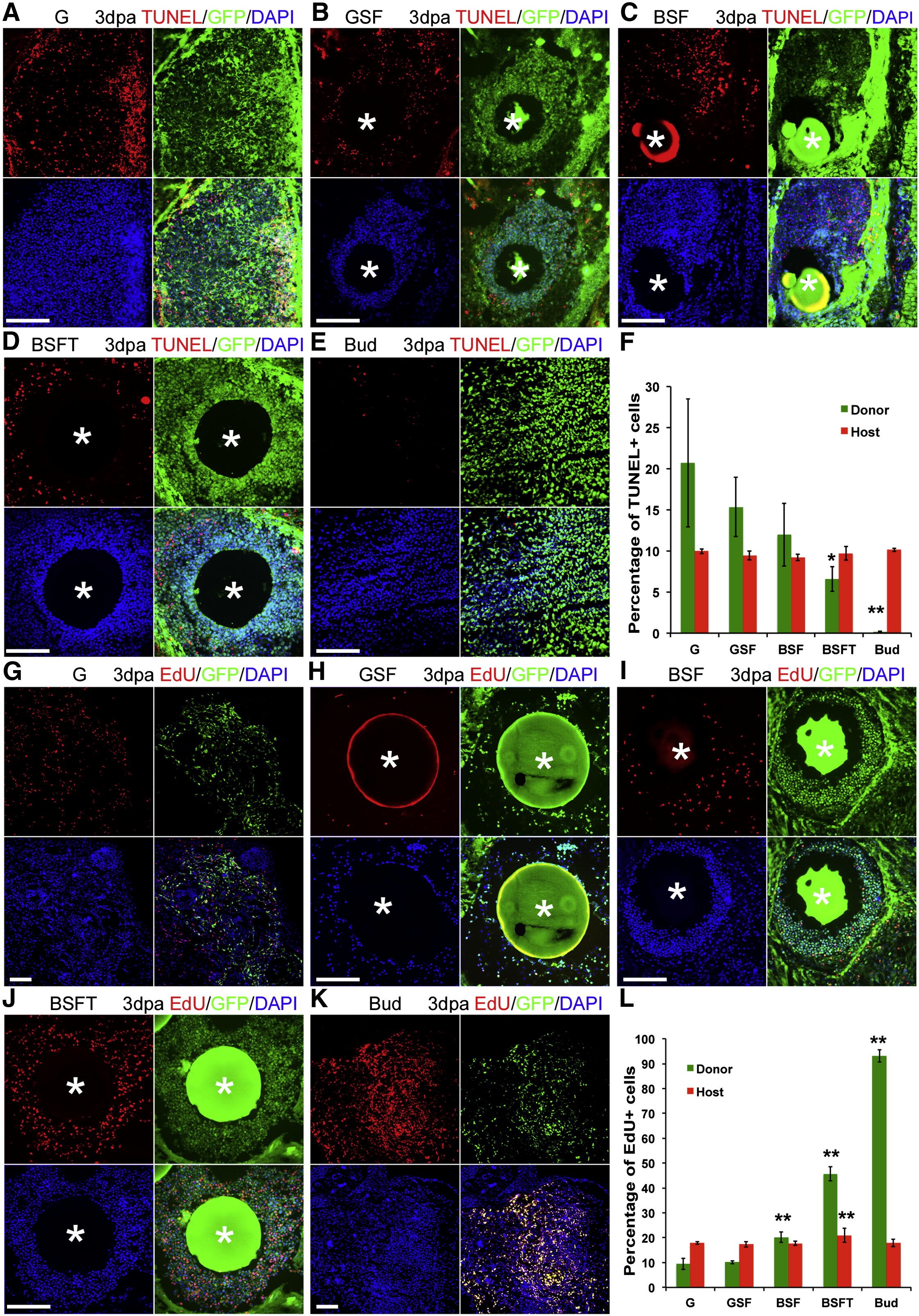 Figure 4. Cell Death and Cell Proliferation Analysis in Cell Transplants(A) Cell death detection by TUNEL in 3 day regenerates after GFP-labeled limb cell patch or bud graft. (A) Cells with GFP label alone. (B) GFP limb cell patch with Shh and FGF10. (C) βcatâ limb cell patch with Shh and FGF10. (D) βcatâ limb cell patch with Shh+FGF10+thymosin β4. (E) Whole limb bud transplantation. Sections are through the cell patch or the transplanted bud. GFP shown in green indicates the nGFP or pHsβcatâGFP donor cells. The TUNEL signal is shown in red, and nuclei are shown in blue with 46-diamidino-2-phenylindole (DAPI) stain. White asterisks (B) indicate positions of Affi-Gel beads. Scale bars, 100 μm.(F) Quantification of cell death in the transplants (G, GFP label only; S, Sonic hedgehog; F, FGF10; B, activated β-catenin; and T, thymosin β4). Error bars are standard deviations; n = 4; single-factor ANOVA shows a significant difference in groups; âp < 0.05, BSFT versus BSF; ââp < 0.01, bud versus BSFT, as determined by t test.(G) Cell proliferation determined by EdU incorporation. EdU is shown in red, and nuclei are shown in blue. White asterisks in (H)J) indicate positions of Affi-Gel beads. Scale bars, 100 μm.(L) Quantification of cell proliferation in the transplants; labels as above. Error bars are standard deviations; n = 4; ANOVA and t test analysis show significant differences between groups. ââp < 0.01, as determined by t test. |
