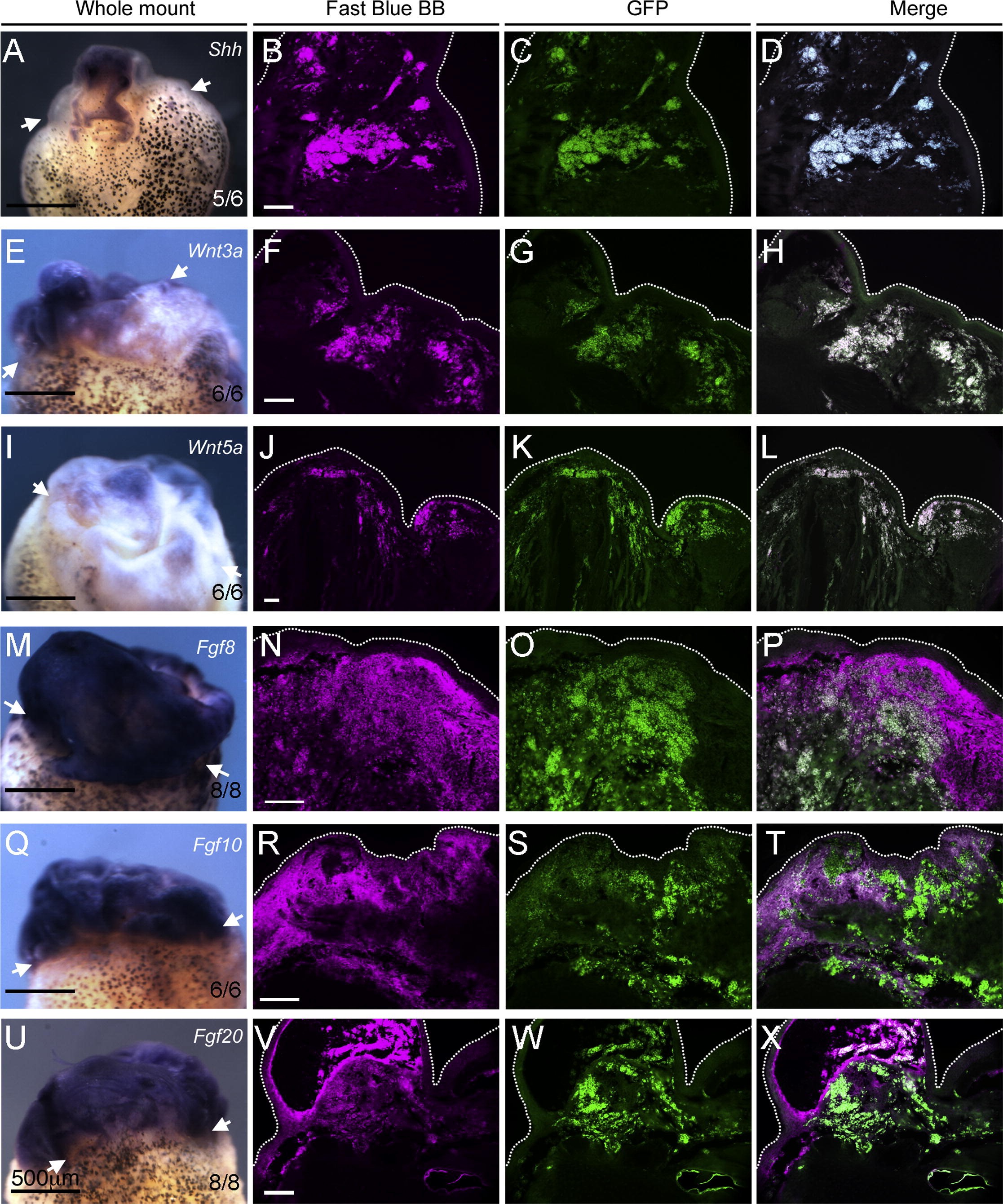 Figure 5. Upregulation of Shh, Wnt, and Fgf Genes in Limb Regenerates(A, E, I, M, Q, and U) Whole-mount in situ hybridization shows expression of Shh, Wnt, and Fgf genes in limbs following BSFT treatment, 6 days pa. Scale bars, 500 μm. Numbers indicate frequency of observed expression in limb regenerates.(B, F, J, N, R, and V) Far-red (magenta) image of in situ signals developed with Fast Blue BB, with Y5 filter cube.(C, G, K, O, S, and W) Detection of GFP-positive cells with anti-GFP antibody and AlexaFluor 488 conjugated secondary antibody, with GFP filter cube.(D, H, L, P, T, and X) Merges: the white color indicates gene expression in GFP-positive cells.(A) Shh, (E) Wnt3a, (I) Wnt5a, (M) Fgf8, (Q) Fgf10, and (U) Fgf20. White dotted lines indicate the edges of the regenerates. Black scale bars, 500 μm; white scale bars, 100 μm. See also Figure S5. |