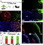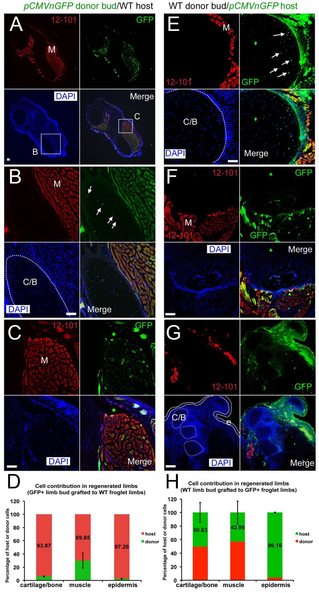 Figure S2. Contribution of donor and host cells in regenerates formed after limb bud grafting (related to Fig. 1) Muscle tissues are shown in red as revealed by immunostaining with 12/101, a specific muscle marker, and labeled as m in the red channels; Cartilage (C/B) is outlined with white dotted circles in the blue channels. Epidermis (e) is outlined with white dotted lines in the blue channels. Scale bars 100um. (A-C) Detection of donor cells by GFP antibody staining (green) in cartilage, muscle (with 12-101 antibody, red), and epidermis, in regenerate from (pCMVnGFP donor) / (wild type host) transplantations. (B, C) are higher power images for outlined areas in (A). White arrows in (B) indicate examples of GFP-positive cells in the cartilage. (D) Quantification of donor and host cell contributions in (pCMVnGFP donor) / (wild type host) transplantations. Error bars are standard derivations (n=9 animals). (E-G) Detection of host cells by GFP antibody staining in regenerate from (wild type bud donor) / (pCMVnGFP host) transplantations in regenerating cartilage/bone (E), muscle (F) and epidermis (G). White arrows in (E) indicate examples of GFP-positive cells. (H) Quantification of donor and host cell contributions in (wild type donor) / (pCMVnGFP host) transplantations. Error bars are standard derivations (n=9 animals). |