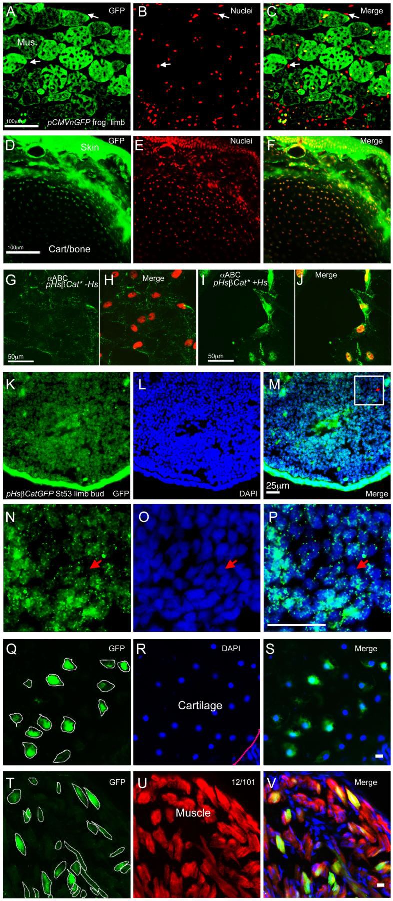 Figure S3. Characterization of pCMVnGFP and pHsBeta-cat*GFP transgenics (related to Fig. 3, 6, 7). (A-F) GFP expression in pCMVnGFP transgenic frog limb. Expression of GFP is detected with anti-GFP and Alexa Fluor 488 conjugated secondary antibody shown in green in muscle (Mus, A), cartilage or bone (Cart/bone, D). Nuclear staining with propidium Iodide is shown in red (B, E). (C, F) merged images. White arrows indicate cells that are negative or very low in GFP expression. Scale bars 100 um. (G-J) Heat shock induced expression of Beta-cat*. Detection of activated beta-catenin (shown in green) by anti-active-ï¢-catenin antibody (alpha-ABC) in limb cells isolated from pHsï¢cat*GFP limb buds, with (I) or without (G) heat shock treatment. Nuclei are shown in red (H, J). Nuclear localization of beta-catenin is apparent after the heat shock induction (J). Scale bars 50 um. (K-P) GFP expression in pHsBeta-cat*GFP tadpole limb bud. Red arrow shows an example of a limb bud cell with very low GFP expression. (N-P) are higher power images for outlined area in (M). Scale bars, 25 um. (Q-V) Illustration of methods for cell counting. (Q, R, S) Contribution of GFP-positive donor cells to regenerating cartilage in one of the sections obtained from an experiment involving transplantation of beta-Cat*GFP donor cells into a wild type host, 13 out of 25 cartilage cells are GFP-positive. The GFP-positive cells are circled in the green channel, and the boundary of the cartilage tissue is shown with the purple dotted line. Scale bar: 10 um. (T, U, V) Contribution of GFP-positive host cells to regenerating muscle tissue. GFP-positive muscle cells are circled in the green channel. Muscle fibers are indicated with 12/101 antibody staining. Of 75 muscle fibers (red channel), 29 are GFP-positive. Scale bar 10 um. |