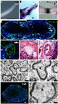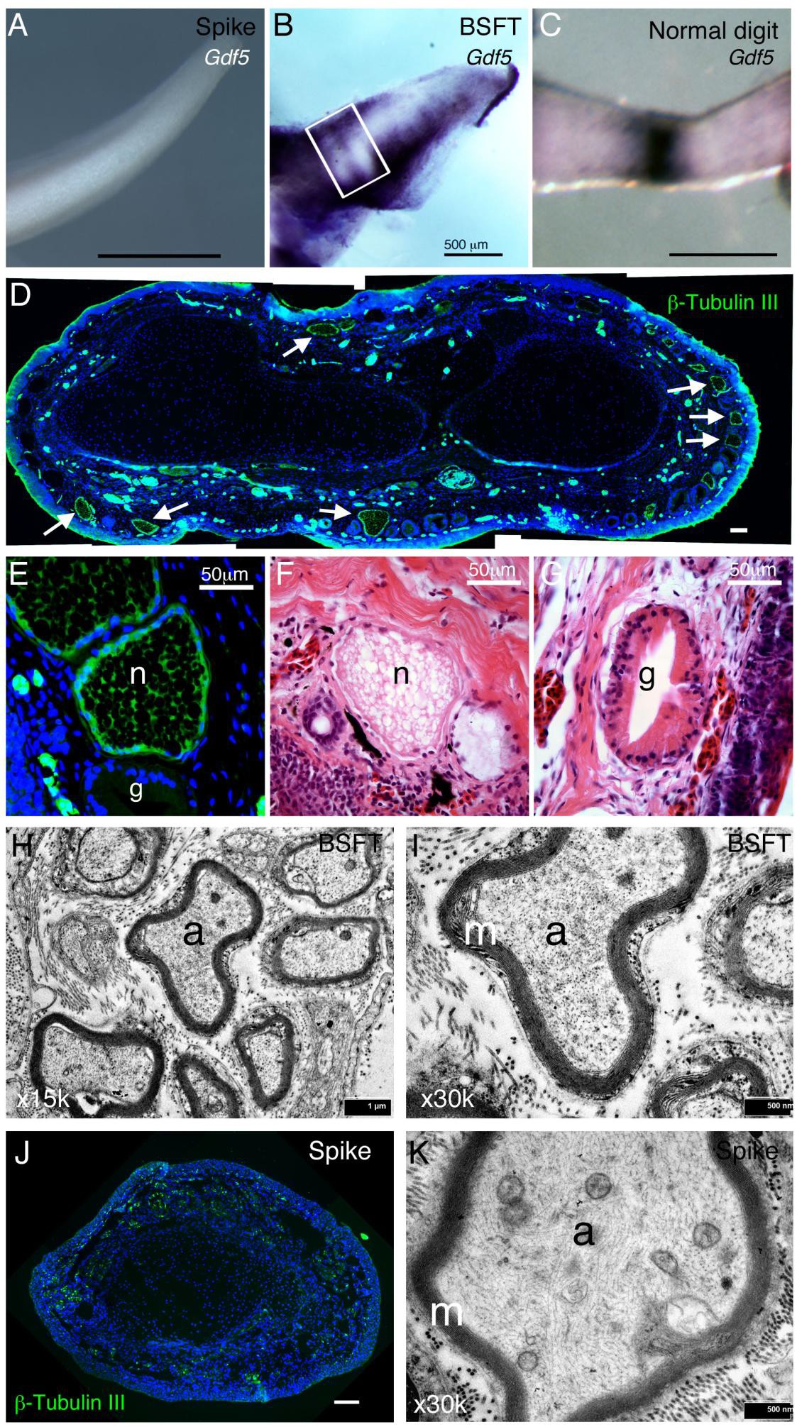 Figure S4. Joint marker expression and nerve innervation in limb regenerate (related to Fig.3). (A-C) Gdf5 is expressed in digit regenerates from Beta-cat* cell patch and Shh, Fgf10, thymosin Beta-4 treatment (BSFT, B), but not expressed in the control cartilaginous spike (A). The white rectangle in (B) indicates Gdf5 expression in a digit regenerate that is similar to the joint of a developing tadpole digit (C). Scale bars 500 um. (D-K) Nerve regeneration in limb regenerates and spikes. Immunofluorescence staining with anti-ï¢-tubulin III antibody (green) indicates abundant innervation in limb regenerate from Beta-cat* cell patch and Shh, Fgf10, thymosin Beta-4 treatment (D, BSFT). White arrows in (D) indicate nerve bundles. (E) Shows a high magnification of nerve bundles (n) that are Beta-tubulin III-positive and a glandular structure (g) that is Beta-tubulin III-negative. (F, G) Histology of a section from the same regenerate in (D) shows the distinct morphology of a nerve bundle (n) and a glandular structure (g). Scale bars in (D-G), 50 um. (H, I) Transmission electron microscopy (TEM) images of axons in limb regenerate from BSFT treatment showing multiple small (2-5 um) myelinated axons at 15K magnification (H) and a single axon (a) with numerous closely packed myelin lamellae (m) at high magnification (30K, I) (G) Immunofluorescence detection of Beta-tubulin III in a control spike, 2 mpa. The spike is innervated but there is a lack of larger nerve bundles. (H) High magnification (30K) TEM image of a single axon in spike. |