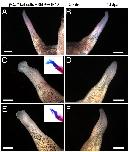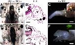 Figure S6. Failure of limb regeneration in frog transplanted with cells from pHsBeta-cat*GFP tadpole tail regeneration bud (related to Table 1). (A, B) The majority of the regenerates show no difference from controls (B). (C-F) Two cases showed slight extra cartilage formation (insets in C, E). (D, F) are spikes regenerated from the control side. dpa, day post amputation. Scale bars 250 um. |