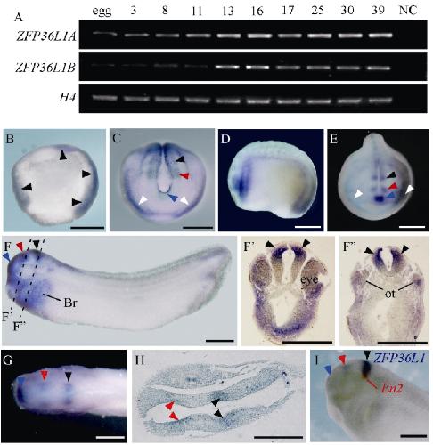 A: RT-PCR analysis of the developmental expression of XZFP36L1A and B; BâI: Expression patterns of XZFP36L1 revealed by WMISH and paraffin sections;