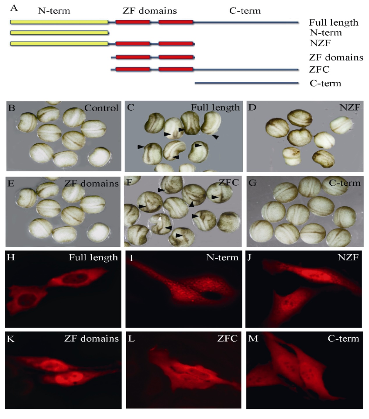 while overexpression of the NZF truncate (D) or ZF domains (E) or C-terminal truncate (G) has no obvious effect on neural tube closure; H-M: Localization of