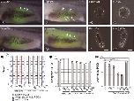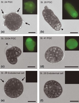 Figure 2. Morphology of isolated primordial germ cells (PGCs) and somatic endodermal cells. (a�f) PGCs isolated from embryos at stages 24 (a), 28 (b), 33/34 (c) and 41 (d), and endodermal cells isolated from embryos at stages 24 (e) and 28 (f) were cultured in the fibronectin-coated culture chamber. Insets show fluorescence images of the cells. The PGCs were labeled with Venus fluorescence. Arrows indicate the small blebs. Arrowheads indicate the large clear blebs. Images were taken after cells adhered on the substrate. Scale bars: 20 μm.