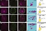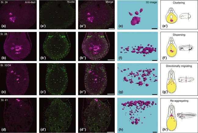 Figure 1. Localization of primordial germ cells (PGCs) in tailbud embryos. (a�d) Transverse section of embryos at stage 24 (a), 28 (b), 33/34 (c) and 41 (d). PGCs were labeled with anti-Xenopus Daz-like protein antibody (magenta; a�d). Nuclei were labeled with Hoechst 33342 (green; a′�d′) 3D images of the in vivo localization of PGCs at stage 24 (e), 28 (f), 33/34 (g) and 41 (h) were constructed with Delta Viewer. PGCs, red. Dorsal side up in all photos, with anterior to the left. (e′�h′) Schematic diagrams of localization of PGCs in tailbud embryos. Very small Dazl-positive fragments did not contain nuclei. PGCs, magenta. Endodermal region, yellow. Scale bars: 100 μm.