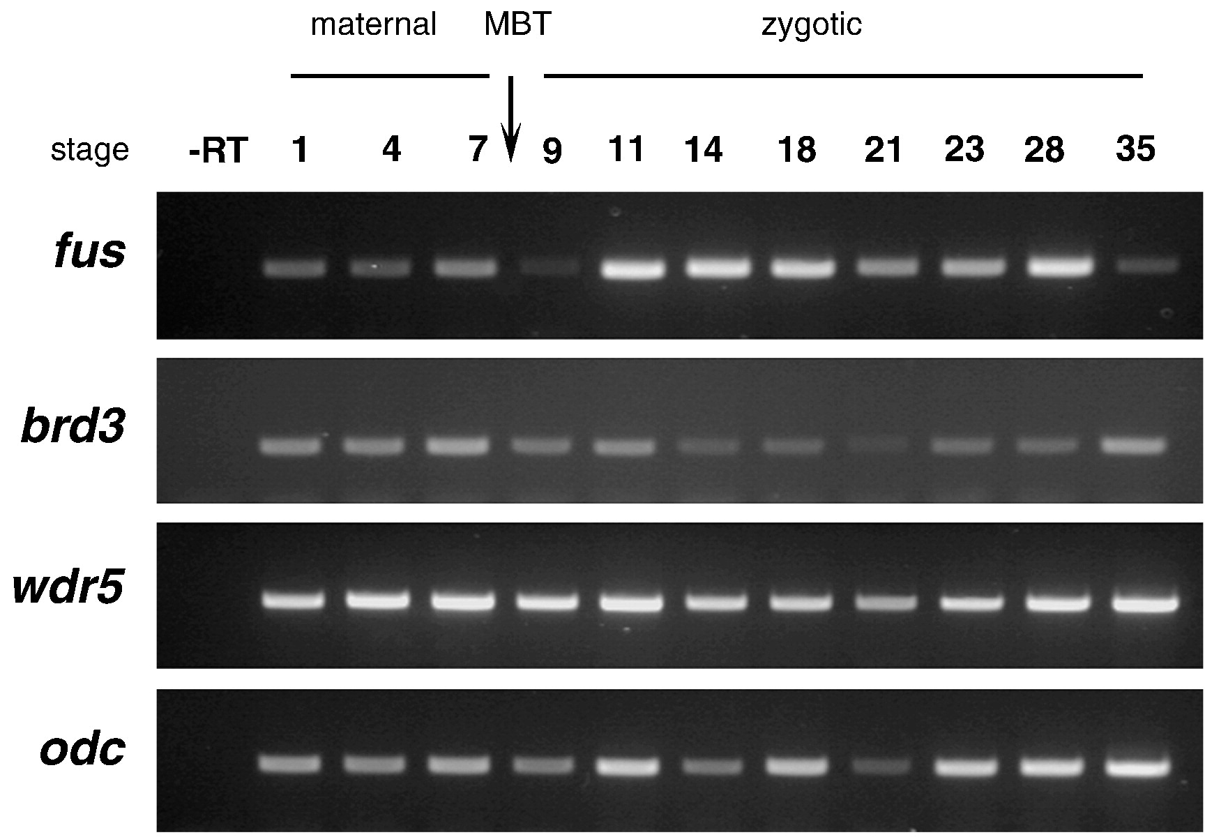 Temporal expression profiles of fus, brd3 and wdr5 during early development. RT-PCR analysis of RNA extracted from embryos at the indicated stages. PCR on RNA without reverse transcription was performed to check the absence of genomic DNA (lane—RT). odc was used as a loading control. In Xenopus laevis the mid-blastula transition (MBT) occurs 6 h after fertilization, at stage 8 and marks the transition between maternal and zygotic gene expression. |