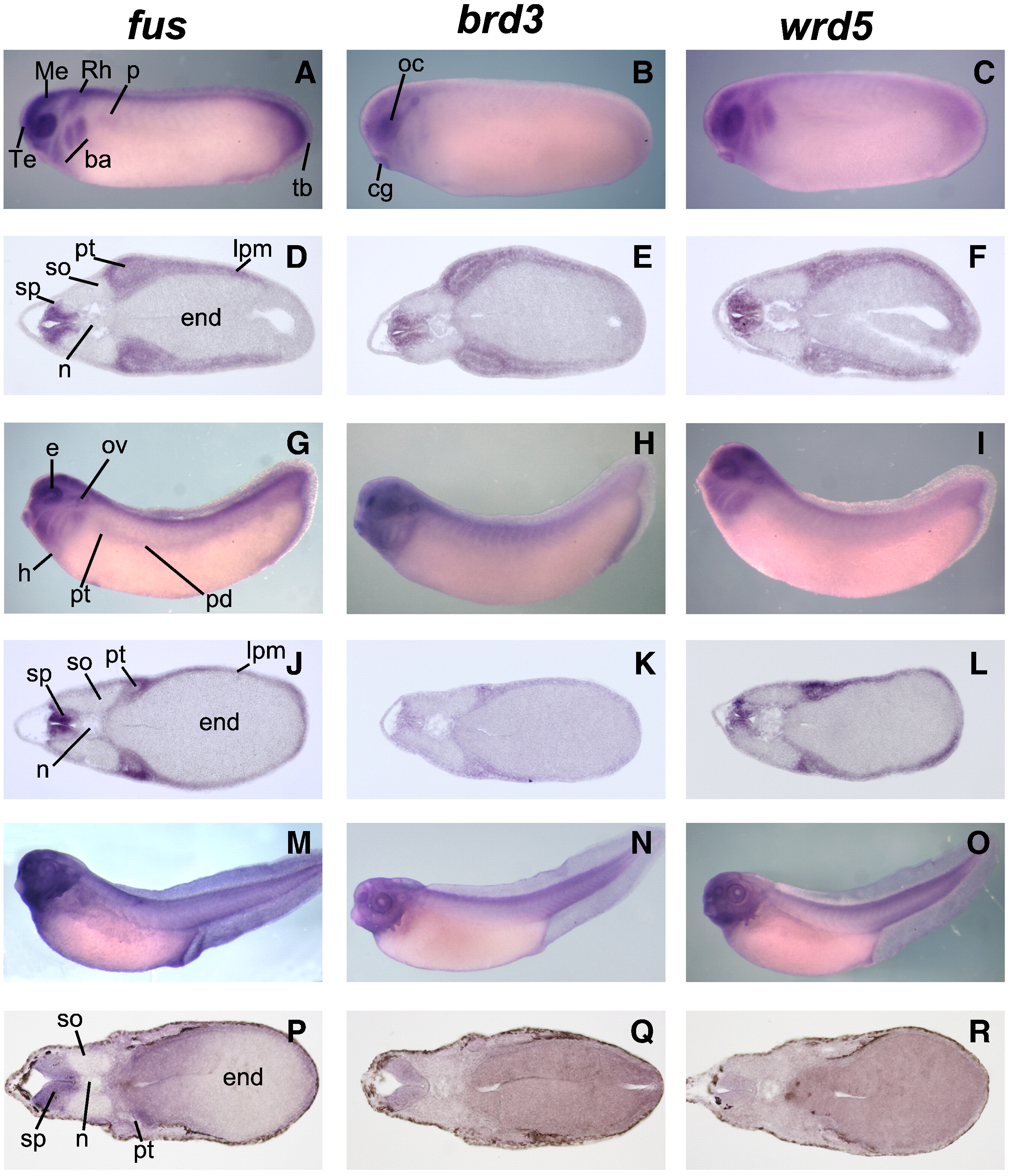Spatial expression patterns of fus, brd3 and wdr5 at taibud and tadpole stages in Xenopus laevis. In situ hybridization is performed on embryos and sections at early (AâF), late tailbud (GâL) and tadpole (MâR) stages. Photomicrographs of whole mounts and sections for fus (left panels), brd3 (middle panels) and wdr5 (right panels) are shown. (AâC) At early tailbud fus, brd3 and wdr5 transcripts are expressed in anterior neural structures; telencephalon (Te), mesencephalon (Me) and rhombencephalon (Rh) and in the optic cup (oc). A strong expression is detected in the branchial arches (ba) for fus and wdr5 (A, C). The cement gland (cg) expressed brd3 and wdr5 (B, C). The tail bud (tb) and the pronephros (p) express fus at this stage (A). (DâE) Transversal sections at the level of the pronephros show the expression of all three transcripts in the spinal cord (sp), the pronephric tubule (pt) and the lateral plate mesoderm (lpm), and the endodermal yolk mass (end), notochord (n) and somites (so) are not labeled. (GâI) Late tailbud stage shows similar labeling patterns to the early tailbud. In addition, the pronephric tubule (pt) and duct (pd) are clearly labeled for fus; and the heart territory (h) for fus and wdr5 (G, I). (JâL) Transversal sections at the level of the pronephros confirm these patterns of expression and reveal that the level of brd3 transcripts decreases at this stage. (MâO) Whole-mounts and (PâR) transversal sections at pronephros level tadpole stage. Section analysis at this stage reveals that fus transcripts remain expressed in spinal cord (sp) and pronephric tubules (pt) brd3 and wdr5 are undetectable in these structures. Abbreviations: ba; branchial arches, cg; cement gland, e; eye, end; endodermal yolk mass, h; heart territory, lpm; lateral plate mesoderm, Me; mesencephalon, n; notochord, oc; optic cup, ov; otic vesicle, p; pronephros, pd; pronephric duct, pt; pronephric tubule, Rh; rhombencephalon, so; somite, sp; spinal cord, tb; tail bud, Te; telencephalon. |