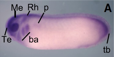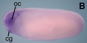 brd3 (bromodomain containing 3) gene expression in Xenopus laevis embryo, assayed via in situ hybridization, NF stage 28, lateral view, anterior left, dorsal up. |
