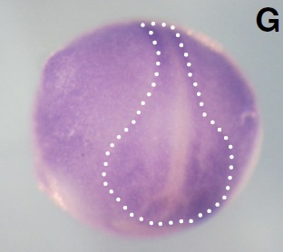 wdr5 (WD repeat domain 5) gene expression in Xenopus laevis embryo, assayed via in situ hybridization, NF stage 11, vegetal view, dorsal up. |