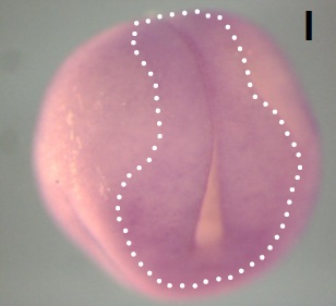 brd3 (bromodomain containing 3) gene expression in Xenopus laevis embryo, assayed via in situ hybridization, NF stage 18, anterior view, dorsal up. |