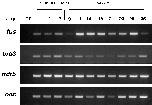 Autoradiographs of 4 replicates membranes carrying bacterially-amplified fragments corresponding to Ca2 +-enriched cDNA and hybridized with 32P-labeled probes from initial caffeine-induced cDNA population (I), control (non-induced) cDNA population (II), subtracted “sense” (caffeine minus control) cDNA population (III) and subtracted “reverse” (control minus caffeine) cDNA population (IV). The F7 spot (blue tag) corresponds to fus gene and illustrates the enrichment of gene expression as it is labeled by the enriched induced minus non induced probe and is undetectable with the initially induced population (compare I and III replicates, at F7) and absent on II and IV replicates. brd3 was found twice on this spotted membrane, at F6 and G4 spots (red tag) and exhibits the same response than fus. p54nrb gene on F4 deposit (green tag) is revealed with both initial and subtracted “sense” probes and is not labeled with non-induced “reverse” populations. The wdr5 expression in caffeine-treated animal cap explants corresponded to the G1 load in the original report [10]. GFP was spotted on H12 as a negative control. |