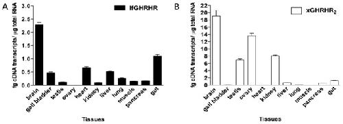 Figure 3. Tissue distribution profile of lfGHRHR and xGHRHR2.Gene expression of (A) lfGHRHR in P. dolloi and (B) xGHRHR2 in X. laevis was assessed by quantitative real-time PCR. The expression level of each gene was calculated from respective standard curve. Data are expressed as mean ± SEM (n = 4). Highest expression for both GHRH receptors was detected in the brain, as observed in mammals.
