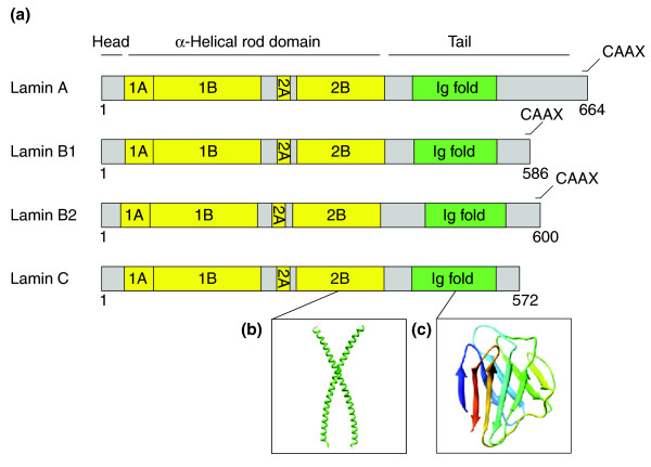 The lamins are the major architectural proteins of the animal cell nucleus. Lamins line the inside of the nuclear membrane, where they provide a platform for the binding of proteins and chromatin and confer mechanical stability. They have been implicated in a wide range of nuclear functions, including higher-order genome organization, chromatin regulation, transcription, DNA replication and DNA repair. The lamins are members of the intermediate filament (IF) family of proteins, which constitute a major component of the cytoskeleton. Lamins are the only nuclear IFs and are the ancestral founders of the IF protein superfamily. Lamins polymerize into fibers forming a complex protein meshwork in vivo and, like all IF proteins, have a tripartite structure with two globular head and tail domains flanking a central α-helical rod domain, which supports the formation of higher-order polymers. Mutations in lamins cause a large number of diverse human diseases, collectively known as the laminopathies, underscoring their functional importance.