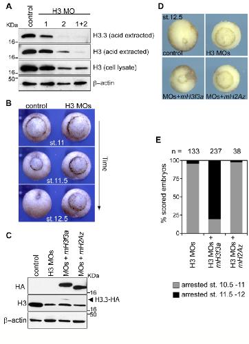 embryos. (A) Western blot analysis of cell lysates (H3 and β-actin) or acid-extracted nuclear fractions (H3.3 and H3) from stage 11 control or H3 MO-injected embryos. (B) Time-lapse images tracking the development of a representative pair of control and H3 MOs-injected embryos from early to late gastrulation. (C) Protein synthesis of injected mRNAs shown by western blot analysis of cellular extracts from embryos injected with H3 MOs and 750 pg of mRNA encoding either HA-epitope-tagged mouse H3.3 or H2Az. (D) Morphology of injected embryos and control siblings at stage 12.5. (E) Percentage of injected embryos arrested at early (stage 10.5-11) or late (stage 11.5-12) gastrula stages. |