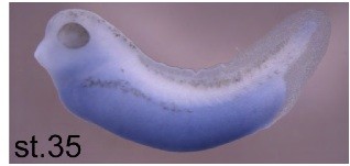 h3f3b (H3 histone, family 3B) gene expression in Xenopus laevis embryo, assayed via in situ hybridization, NF stage 35, lateral view, anterior left, dorsal up.