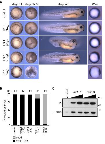 Fig. S2. Overexpression of H3.3 leads to early embryonic lethality. (A) Embryos at the two- to four-cell stages were injected with 1 or 2 ng of mRNA encoding HA-tagged H3.1 or H3.3. Injected embryos were either allowed to develop to late tailbud stage, or fixed at stage 10.5 and subjected to whole-mount in situ hybridization analysis of Xbra expression. (B) Percentage of injected embryos that developed normally to late gastrula stage 12.5. (C) Synthesis of exogenous H3.1- HA or H3.3-HA proteins in injected embryos detected by immunoblotting for the HA epitope. |
