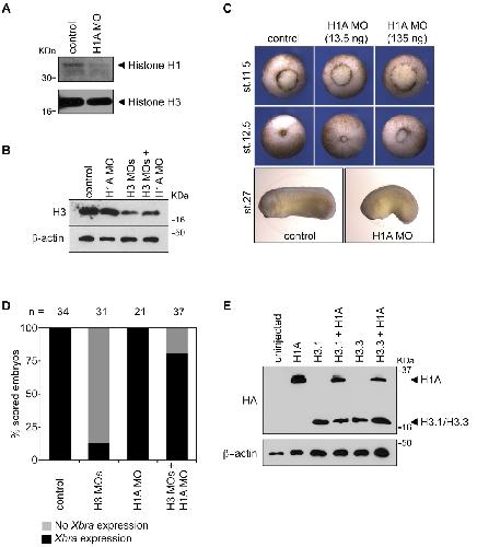 Fig. S6. Mesodermal competence is regulated by interplay between nucleosomal H3 and linker histone H1. (A) Synthesis of somatic linker histone H1A is inhibited by H1A antisense MO. Western blot analysis of acid nuclear extracts from gastrula stage control or H1A MO-injected embryos shows ~70% knockdown of histone H1 (arrow). (B) Western blot analysis of endogenous H3 protein levels in gastrula stage control and injected embryos. (C) Time-lapse images tracking development of control and H1A-depleted embryos. Development of H1A knockdown embryos was slightly delayed but otherwise normal. (D) Percentage of control and injected embryos that express Xbra. Embryos from two independent experiments were fixed at early gastrula and subjected to RNA in situ hybridization analysis of Xbra transcripts. (E) Protein synthesis of injected mRNAs shown by western blot analysis of cellular extracts from stage 10.5 embryos. |