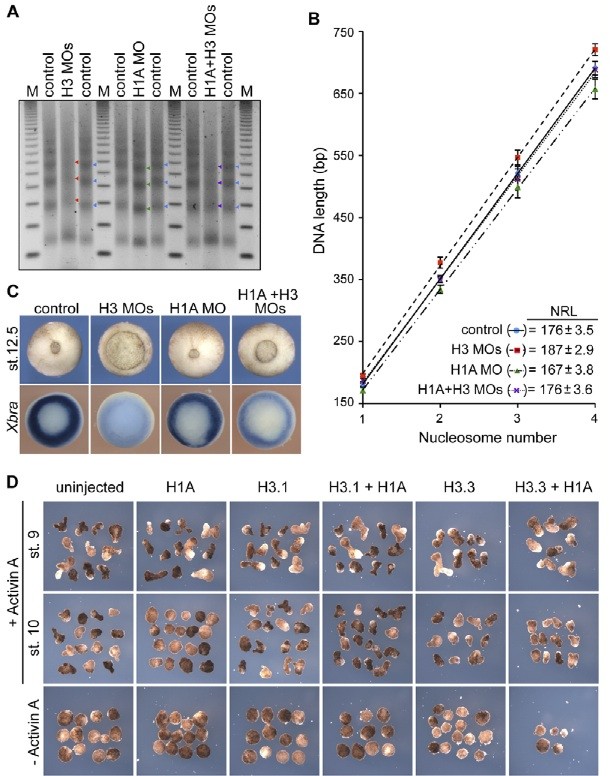 Fig. 5. Mesodermal competence is regulated by interplay of nucleosomal H3 and linker histone H1. (A) Nucleosomal ladders resulting from micrococcal nuclease digests of nuclei from control, H3.3 H1Aand H3.3+H1Aknockdown embryos. Arrows point to di-, tri- and tetra- nucleosomes; M is the 123bp DNA ladder. (B) Oligomeric DNA length was calculated and plotted against the nucleosome number. Error bars indicate s.d. of six independent experiments. The mean nucleosomal repeat length (NRL) in each set of embryos is indicated with s.d. (C) Embryos injected with H3 MOs alone, H1A MO alone or H3 and H1A MOs were either cultured to late gastrula stage 12.5 (top panels), or fixed at stage 10.5 and subjected to in situ hybridization analysis of Xbra expression (bottom panels). (D) Animal caps excised from stage 8 control or embryos injected with H1A (1.5 ng), H3.1 (1.5 ng), H3.3 (1 ng) or combinations of H1A+H3.1/H3.3 mRNAs, were exposed to Activin A at late blastula and early gastrula stages, and cultured until stage 25. |