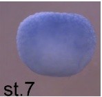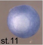 h3-3b (H3.3 histone B) gene expression in Xenopus laevis embryo, assayed via in situ hybridization, NF stage 2, animal view. |