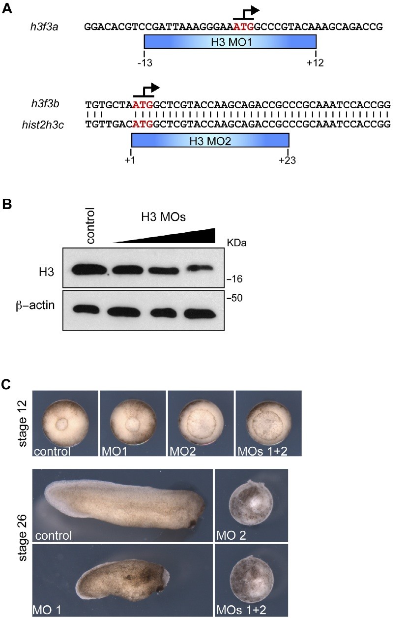 Fig. S3. Developmental defects in embryos partially or completely depleted of H3.3. (A) Target regions of H3 MO1 and MO2. (B) Western blot analysis showing dose-dependent depletion of endogenous H3 proteins in H3 MO-injected embryos. Doses of H3 MOs tested were 6.5 ng, 26 ng and 65 ng. (C) Development of control or embryos injected with H3 MO1 or MO2 alone or MO1+MO2 at stages 12 and 26. |