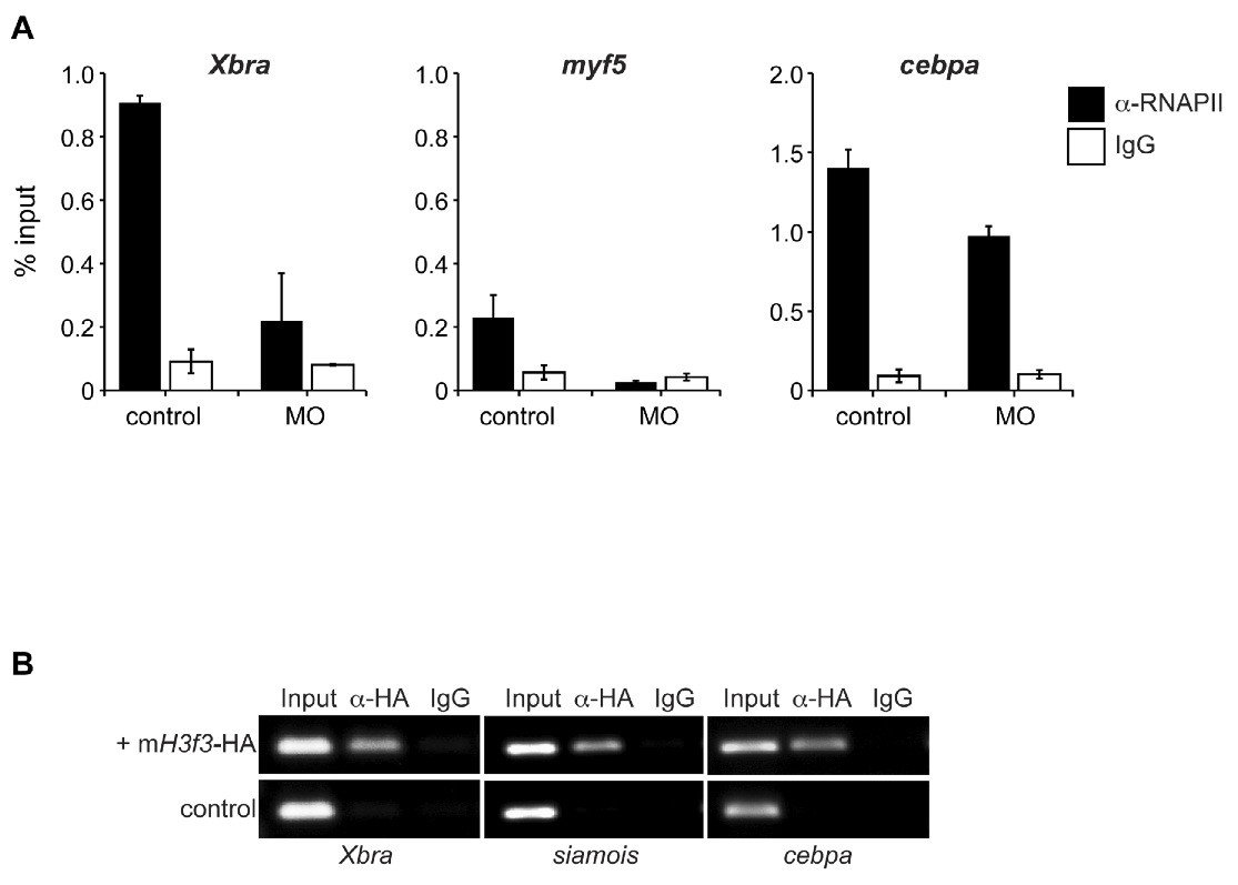 Fig. S4. Presence of RNA polymerase II and H3.3 at the promoters of active genes in gastrula embryos. (A) Presence of endogenous RNA polymerase II at the promoters of Xbra, myf5 and cebpa were analyzed by ChIP-qPCR analysis of stage 10.5 control and H3 MOs-injected embryos. Level of enrichment is determined as a percentage of input. (B) Chromatin immunoprecipitation using anti-HA antibody was performed on stage 10.5 control and embryos injected with 750 pg of mH3.3a-HA mRNA. Presence of H3.3-HA at the promoters of Xbra, siamois and cebpa were analyzed by PCR using promoter-specific primers. |