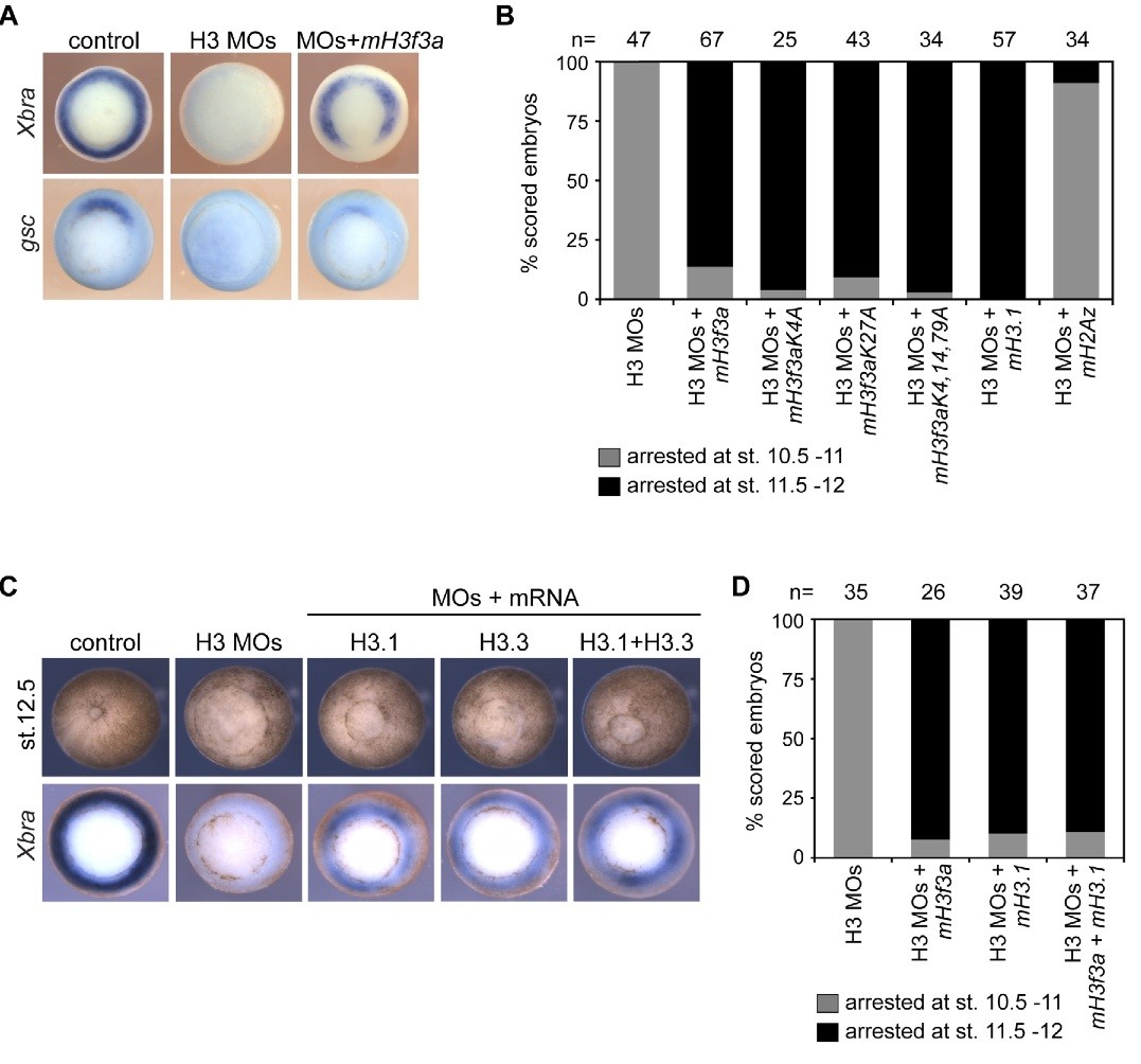 Fig. S5. Mesoderm formation and gene expression in H3 MOs morphants is rescued by co-injection of mouse H3f3a mRNA. (A) Control and injected embryos fixed at early gastrula were subjected to RNA in situ hybridization analysis of Xbra and gsc transcripts. (B) Percentage of embryos co-injected with mRNA encoding HA-tagged wild-type or mutant H3.3, or H3.1 that arrested at early (stage 10.5-11) or late (stage 11.5-12) gastrula stages. (C) Rescue experiments were performed by co-injecting H3.3 MO with a total amount of 750 pg of mRNA encoding HA-tagged H3.1 or H3.3, or