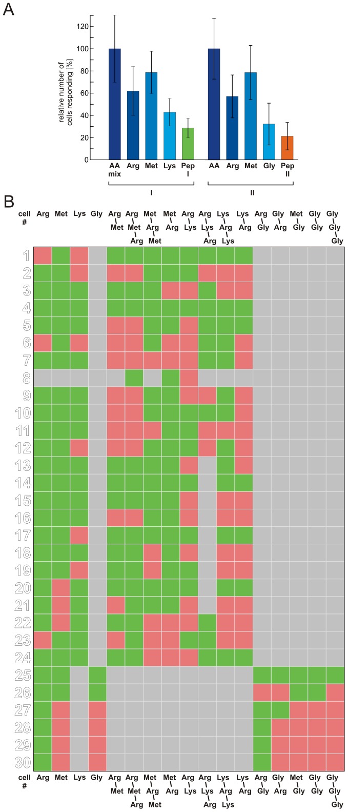 Figure 2. Response profiles of ORNs to amino acid and peptide stimulation.(A) Relative number of amino acid-sensitive ORNs reacting to individual amino acids (200 µM) or at least to one of the thirteen tested peptides. Only a fraction of amino acid-responsive ORNs also responded to group I peptides (1 mM, 12 of 42 ORNs in four slices) or group II peptides (200 µM, 6 of 28 ORNs in four slices). The fraction of ORNs sensitive to group I peptides did not differ from the fraction of ORNs sensitive to group II peptides. (B) Response matrix of all peptide-sensitive ORNs to the applied stimuli (green, response to applied stimulus; red, no response; grey, not tested; applied peptide concentration: ORN #1–#12, 1 mM; ORN #13–#21, 5 mM; ORN #22–#24, 10 mM; ORN #25–#31, 200 µM). [AA mix: amino acid mixture, AA: amino acids, Arg: L-arginine, Met: L-methionine, Lys: L-lysine, Gly: glycine, Pep I: group I peptides, Pep II: group II peptides]. |