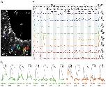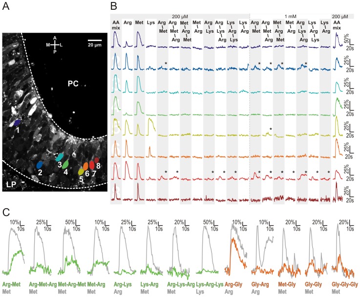 Figure 1. Amino acid- and peptide-induced changes in calcium-dependent fluorescence of individual ORNs in slices of the olfactory epithelium.(A) Slice preparation of the OE of larval Xenopus laevis stained with Fluo-4 AM. The colored ovals (#1â#8) indicate the eight ORNs that were responsive to the mixture of amino acids. (B) Time courses of [Ca2+]i transients of the eight ORNs marked in A, elicited by application of amino acids (L-arginine, L-methionine and L-lysine as a mixture or singularly; each at a concentration of 200 µM) and peptides (consisting of L-arginine, L-methionine and L-lysine; 200 µM and 1 mM). Discernible peptide induced [Ca2+]i transients are marked by an asterisk. To check for ORN viability, the mixture of amino acids was applied at the end of the experiment. (C) Examples of peptide induced calcium transients originating from different ORNs (group I peptides, green, L-arginyl-L-methionine (Arg-Met), 5 mM; L-arginyl-L-methionyl-L-arginine (Arg-Met-Arg), 1 mM; L-methionyl-L-arginyl-L-methionine (Met-Arg-Met), 1 mM; L-methionyl-L-arginine (Met-Arg), 5 mM; L-arginyl-L-lysine (Arg-Lys), 200 µM; L-lysyl-L-arginine (Lys-Arg), 1 mM; L-arginyl-L-lysyl-L-arginine (Arg-Lys-Arg), 1 mM; L-lysyl-L-arginyl-L-lysine (Lys-Arg-Lys), 1 mM;; group II peptides (see Material and Methods), orange, all applied at 200 µM). As reference also the highest amino acid-induced (200 µM) calcium transient is depicted. [AA mix: amino acid mixture]. |