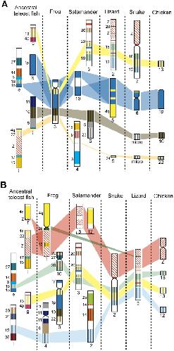 Figure 5. Schematic representation of the protokaryotypes of amniotes and tetrapods and their evolutionary processes.The schematic diagrams of the vertebrate chromosomes are modified from the genome and/or chromosome maps of Ambystoma mexicanum/A. tigrinum