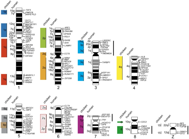 Figure 2. Comparative cytogenetic map of macrochromosomes of the Chinese soft-shelled turtle (Pelodiscus sinensis).Homologous chicken and human chromosomes are shown to the left of each turtle chromosome (see Table S1). Genetic linkages that are homologous to chicken macrochromosomal arms and/or macrochromosomes (GGA1p, 1q, 2p, 2q, 3, 4q, and GGA5–8) are represented by 10 differently colored bars, and segments drawn with diagonal lines indicate the chicken Z chromosome. The G-banded ideograms of the turtle chromosomes, which were constructed using Hoechst 33258-stained band patterns obtained by the replication banding method, were taken from our previous report [37]. Solid bars to the right of the turtle chromosomes indicate the chromosomal segments in which intrachromosomal rearrangements occurred that resulted in differences between the turtle and chicken chromosomes. |