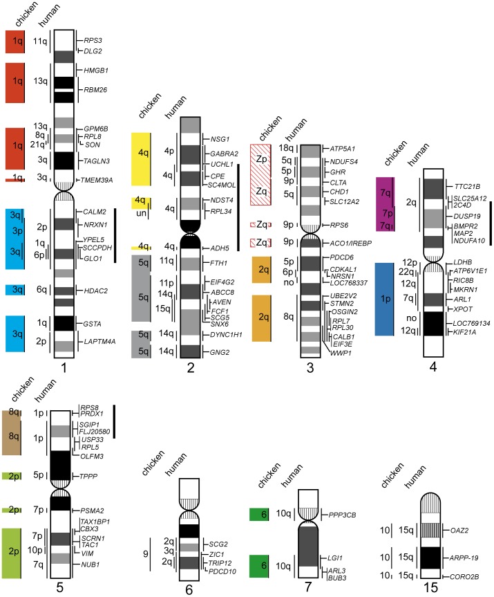 Figure 3. Comparative cytogenetic map of the eight largest chromosomes of the Siamese crocodile (Crocodylus siamensis).Homologous chicken and human chromosomes are shown to the left of each crocodile chromosome (see Table S2). Genetic linkages of chicken macrochromosomal arms and/or macrochromosomes are represented by the same colored bars as those in Figure 2. The G-banded ideograms of the crocodile chromosomes were constructed in the present study by the same method as that used for the turtle chromosomes [37]. Solid bars to the right of the crocodile chromosomes indicate the chromosomal segments in which intrachromosomal rearrangements occurred between the crocodile and chicken. un, chromosomal location is unknown in chicken. no, no homologs were found. |