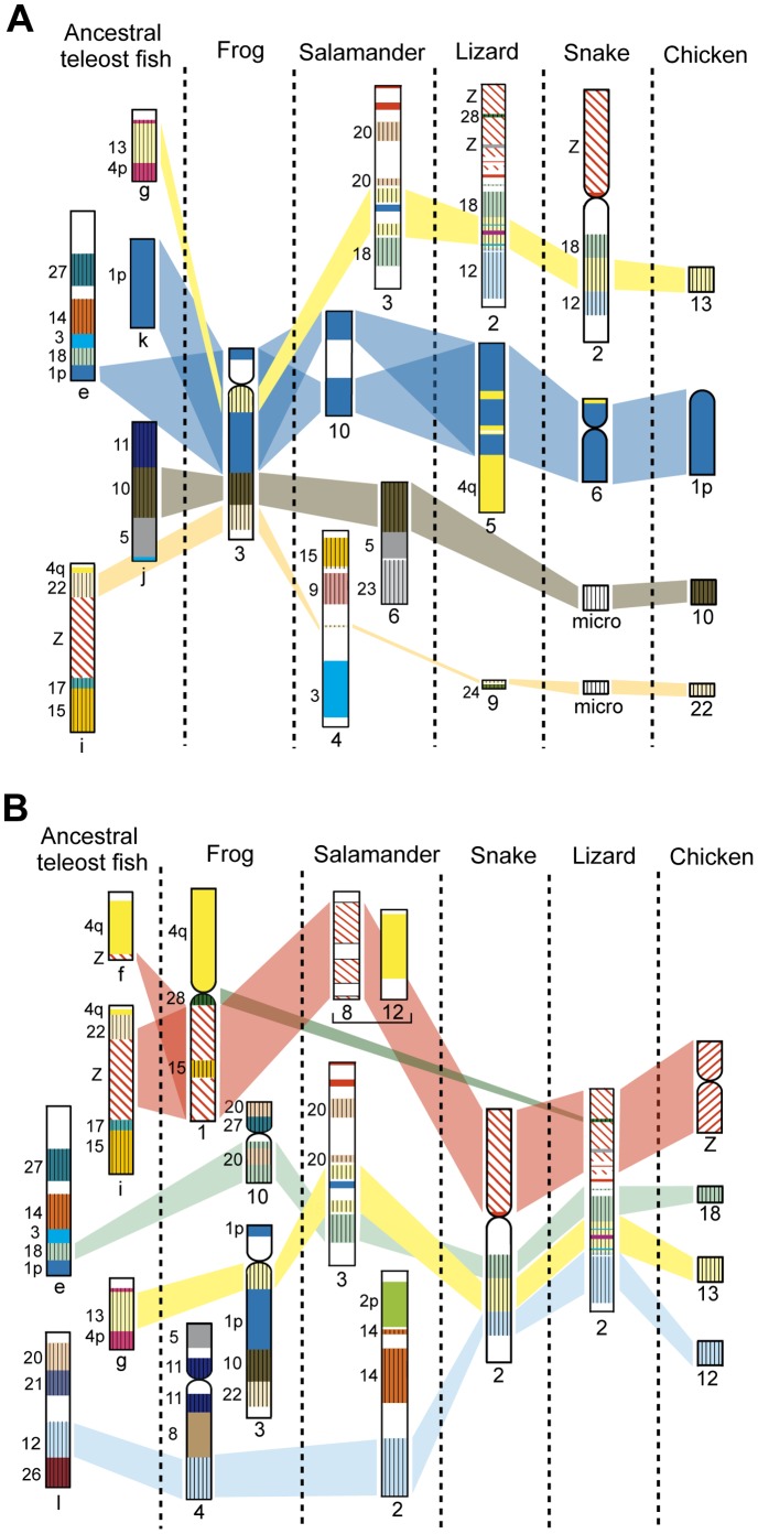 Figure 6. Comparison of chromosomal locations of chicken microchromosomal linkages among vertebrate species.The chromosomal locations of chicken microchromosomal linkages on X. tropicalis chromosome 3 (A) and E. quadrivirgata chromosome 2 (B) are compared among four tetrapod species, X. tropicalis, salamander (A. mexicanum/A. tigrinum), lizard (A. carolinensis), and snake (E. quadrivirgata), and ancestral teleost fish. Genetic linkages of chicken macro- and microchromosomes are represented by the same colored bars as those in Figure 5, and each conserved genetic linkage was defined when two or more genes were located on each of chicken chromosomes. The chromosome numbers of the chicken microchromosomes are shown to the left of each chromosome. Information on the genetic linkages for the ancestral teleost fish, salamander, snake, lizard, and chicken was taken from Kasahara et al. [17] and Nakatani et al. [24], Voss et al. [27], Matsubara et al. [31], [32], Alföldi et al. [19] and the Ensembl Anole Lizard Genome Browser (http://www.ensembl.org/Anolis_carolinensis), and the Ensembl Chicken Genome Browser (http://www.ensembl.org/Gallus_gallus), respectively. The lizard chromosome that is homologous to GGA10 has not been identified yet. The genetic linkages of GGA10, 13, and 22 on X. tropicalis chromosome 3 and GGA12, 13, and 18 on snake chromosome 2 were localized to nonhomologous chromosomes in the other species, except for GGA13 and GGA18 on salamander chromosome 3. The salamander linkage 8 and 12 were contained in the same linkage group [26], [27], [49]. |
