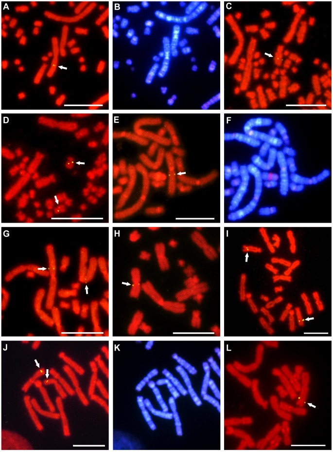 Figure 1. Chromosomal localization of functional genes in P. sinensis, C. siamensis, and X. tropicalis.Localization of cDNA clones to chromosomes of P. sinensis (AâD), C. siamensis (EâH), and X. tropicalis (IâL) by FISH. The COLEC12 (A), COQ6 (C), and SCG2 (D) genes were localized, respectively, to chromosomes 2q and 5q, and the long arms of a submetacentric microchromosomal pair in P. sinensis. The PDCD6 (E), SON (G), and ATP6V1E1 (H) genes were localized, respectively, to chromosomes 3q, 1p, and 4q in C. siamensis. The ACTN1 (I), USP5 (J), and LARP4 (L) genes were localized, respectively, to chromosomes 8q, 7p, and 2q in X. tropicalis. Hoechst-stained patterns of the PI-stained metaphase spreads in (A), (E), and (J) are shown in (B), (F), and (K), respectively. Scale bars represent 10 µm. Arrows indicate the fluorescence signals. |