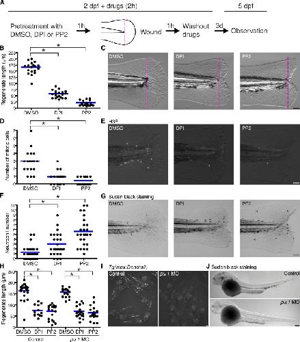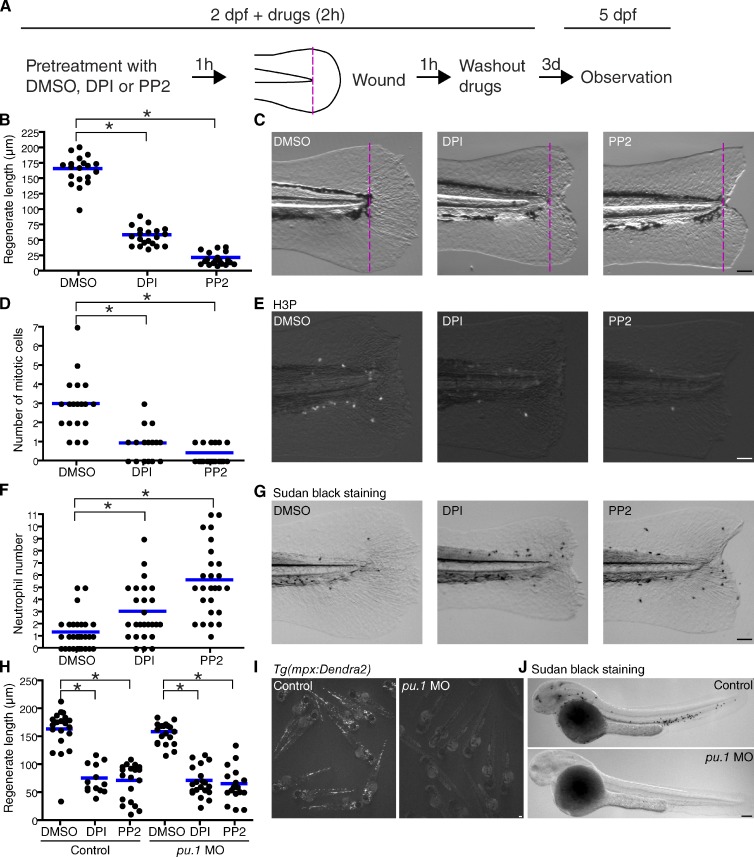 Figure 2. Early redox and SFK signaling regulates late epimorphic regeneration. (A) Diagram of regeneration assays using zebrafish larval tail fins. (B) Quantification of regenerated tail fin length at 3 d after wounding (DMSO: 19 larvae; DPI: 20 larvae; PP2: 19 larvae). (C) Representative pictures used for quantification in B. Dotted lines indicate tail transection. (D) Quantification of blastemal proliferation at 36 h after wounding (DMSO: 19 larvae; DPI: 19 larvae; PP2: 21 larvae). Mitotic cells were detected using an antibody for phosphorylated histone H3 (H3P). (E) Representative pictures used for quantification in D. (F) Quantification of neutrophil recruitment to wounded fins at 3 d after wounding (DMSO: 30 larvae; DPI: 25 larvae; PP2: 25 larvae). (G) Representative pictures of Sudan black staining used for quantification in F. (H) Quantification of regenerated tail fin length at 3 d after wounding in control larvae and pu.1 MO-injected larvae (control/DMSO: 20 larvae; control/DPI: 13 larvae; control/PP2: 19 larvae; pu.1 MO/DMSO: 20 larvae; pu.1 MO/DPI: 20 larvae; pu.1 MO/PP2: 20 larvae). (I) Fluorescent pictures of 2.5-dpf Tg(mpx:Dendra2), which expresses Dendra2 specifically in neutrophils. (J) Sudan black staining of control larvae and pu.1 MO-injected larvae at 2.5 dpf. *, P < 0.05; one-way ANOVA with Dunnett’s posttest. Horizontal lines indicate means. Bars: (C, E, and G) 50 µm; (I and J) 100 µm.