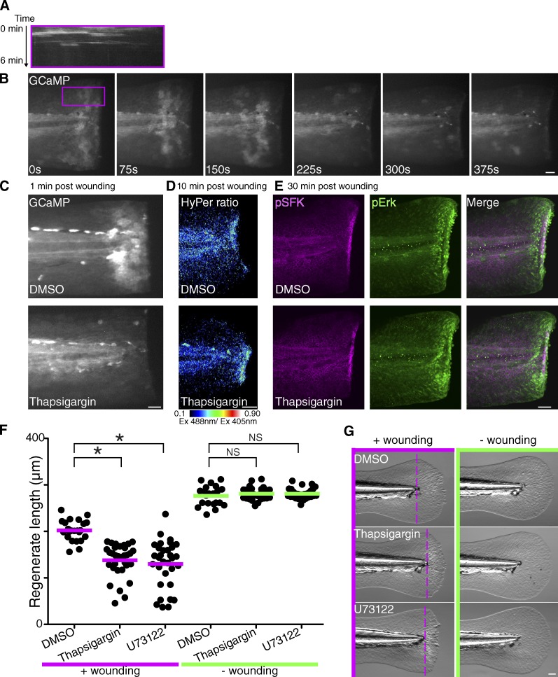 Figure 3. Wound-induced Ca2+ signaling is important for late regeneration. (A) Kymograph in the rectangular box in B. The rectangular box was summed into a 1D line, and the kymograph was made. (B) Time-lapse imaging of GCaMP3 in a 2-dpf larva immediately after wounding (see Video 1). (C) GCaMP3 images in DMSO- or thapsigargin-treated 2-dpf larvae (Video 2). (D) H2O2 imaging with HyPer in DMSO- or thapsigargin-treated 2-dpf larvae. Thapsigargin does not inhibit H2O2 burst at wounds. (E) Immunofluorescence of pSFK and pErk in DMSO- or thapsigargin-treated 2-dpf larvae. Thapsigargin did not inhibit pSFK or pErk at wounds. (F) Quantification of tail fin length at 3 d after treatment (+wound/DMSO: 23 larvae; +wound/thapsigargin: 32 larvae; +wound/U73122: 32 larvae; −wound/DMSO: 21 larvae; −wound/thapsigargin: 32 larvae; −wound/U73122: 30 larvae). Horizontal lines indicate means. (G) Representative pictures at 3 d after treatment. 2-dpf larvae were treated and wounded as described in Fig. 2 A. Dotted lines indicate tail transection. *, P < 0.05; one-way ANOVA with Dunnett’s posttest. Ex, excitation. Bars, 50 µm.