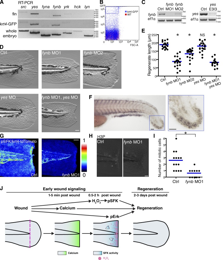 Figure 5. Fynb is responsible for epimorphic regeneration. (A) RT-PCR of SFKs. hck and lyn, hematopoietic-specific SFKs, are negative controls. (B) Tg(krt4:GFP) larvae at 3 dpf were used for flow cytometry. GFP high fractions (boxed with a blue line) were sorted. Cells from wild-type larvae were used to set the background level of autofluorescence. (C) RT-PCR of fynb and yes with/without MOs. ef1-α is the loading control. (D) Representative pictures at 3 d after wounding. (E) Quantification of regenerated tail fin length at 3 d after wounding (control [Ctrl]: 19 larvae; fynb MO1: 20 larvae; fynb MO2: 21 larvae; yes MO: 20 larvae; fynb MO1/yes MO: 16 larvae). (F) In situ hybridization of fynb mRNA in 2-dpf larvae. The tail fin in the blue box is magnified on the right. (G) Ratio images of pSFK/krt4-tdTomato in control and fynb morphants. (H) Mitotic cells were detected by antibody staining for phosphorylated histone H3 (H3P) at 36 h after wounding. (I) Quantification of blastemal proliferation at 36 h after wounding (control: 14 larvae; fynb MO1: 12 larvae). (J) A proposed model showing early wound signaling-mediated regulation of late regeneration. (E and I) *, P < 0.05; one-way ANOVA with Dunnett’s posttest (E) and two-tailed unpaired t test (I). Horizontal lines indicate means. Bars, 50 µm.