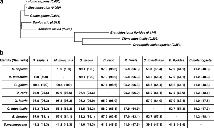 Fig. 2. Illustration of the evolutionary relationship of Isl1 genes in different species. a The phylogenetic tree was generated using Clustal W (http://www.ebi.ac.uk/Tools/phylogeny/clustalw2_phylogeny/) (Chenna et al. 2003). Numbers indicate the genetic distance between the nodes of the tree. Sequences used were: NP_002193.2 (Homo sapiens), NP_067434.3 (M. musculus), NP_571037.1 (D. rerio), NP_990745.1 (G. gallus), NP_001104188.1 (X. laevis), AF226616_1 (Branchiostoma floridae), NP_001027767.1 (C. intestinalis), NP_476775.1 (D. melanogaster). b Comparison of Isl1 protein sequences. The percentages depict the degree of identical and similar (in parentheses) amino acids |