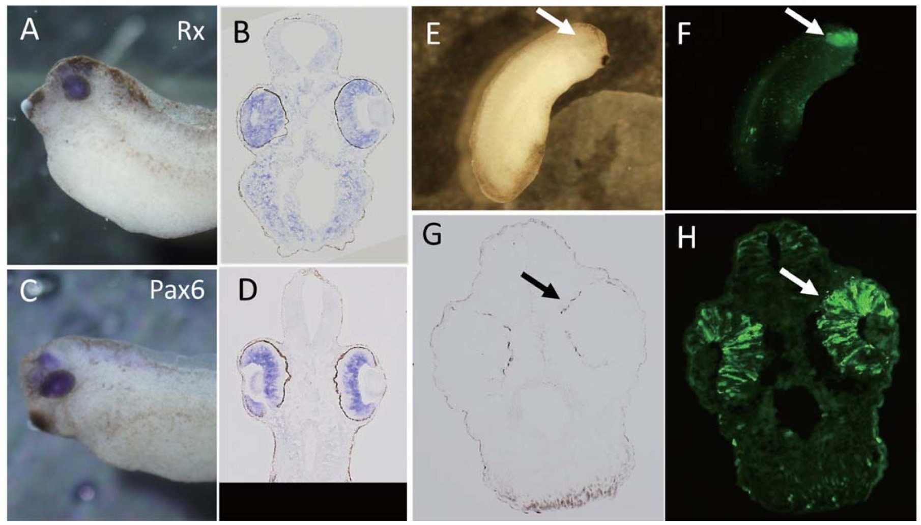 FIG. 1. Expression of the Rax gene in the transgenic Xenopus F0 founder. A, B: In situ hybridization of the Rax gene in Xenopus embryos at St. 35. In both whole mount and section preparations, Rax was expressed specifically in the neural retina. C, D: Pax6 is also expressed similarly to Rax at this stage of development. E: EGFP expression in transgenic animals at St. 27 (E, F) and St. 31 (G, H). EGFP is local- ized only in the eye region. In H, the neural retina is intensely stained for EGFP and the lens is devoid of staining.