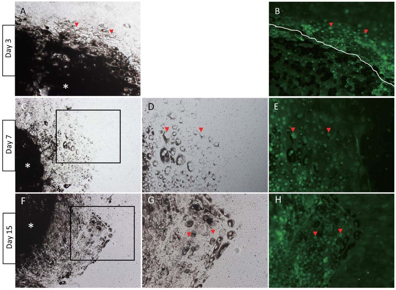 FIG. 3. Real time detection of EGFP fluorescence by Rax-promoter activity in cultured RPE cells. A, B: Day 3, (C) Day7, (F) Day 15. In A and B, only a few cells are positive for EGFP within the explant (asterisks), while many cells express EGFP in the epithelial zone. The dotted line shows the boundary of the explant and the epithelial zone. The red arrowheads indicate cells with EGFP fluorescence. In C, cells in the epithelial zone are positive for EGFP fluorescence, while those in the transition zone become mostly negative (red arrowheads). In F, similar observations were obtained in cultures at Day 15, and cells in the transition zone show faint EGFP fluorescence (red arrow- heads). The areas demarcated by the rectangular squares in C and D are shown at a higher magnification in D, E and G, H, respectively.