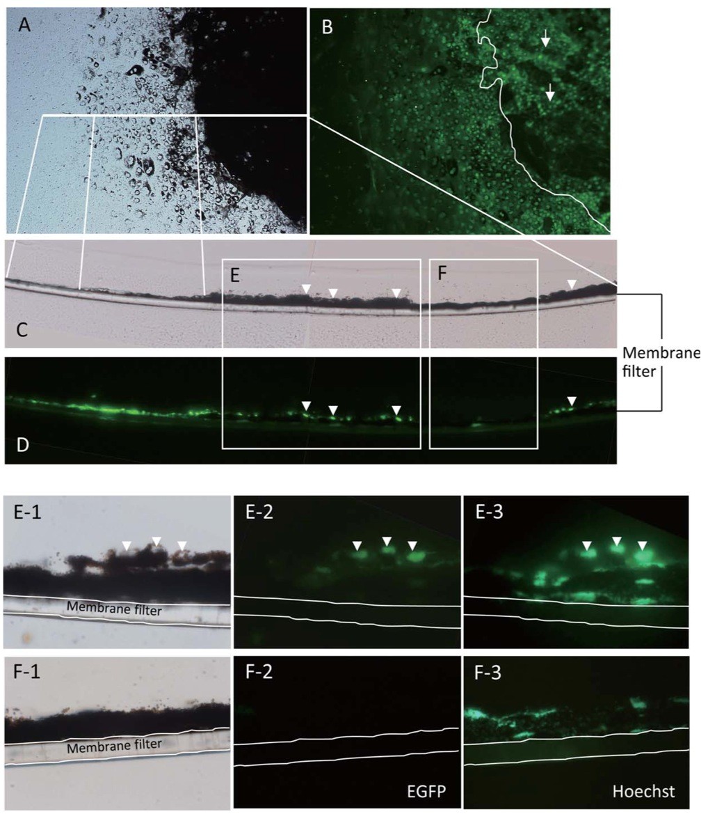 FIG. 4. EGFP expression in the cultured RPE cells. A, B: Phase contrast (A) and EGFP fluorescence (B) micrographs of the same culture on Day 5. The dotted line demarcates the explant from the epithelial zone. Real time EGFP fluorescence is seen in some of the cells in the explant zone (arrows in B). Most of the cells in the epithelial zone appear to show EGFP fluorescence, while in the transition zone only a few cells have fluorescence. (C, D) Cultures in A were fixed, and sections were made vertically to the membrane filter. They were immunostained for EGFP. EGFP-positive cells are shown by arrowheads. The areas demarcated by rectangular squares in C and D are shown in E-1 to E-3 and F-1 to F-3. E-2 and F-2 show EGFP immunofluorescence, while E-3 and F-3 are Hoechst nuclear staining. Arrowheads in E-1, E-2 and E-3 show identical cell nuclei. Fine dotted lines in E and F indicate the position of membrane filters.
