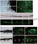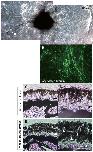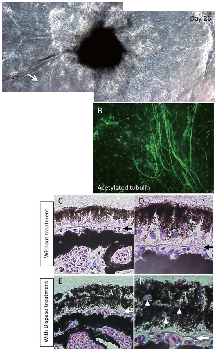 FIG. 5. Neuronal differentiation in Matrigel embedding culture of an explant consisting of RPE and choroid and the effect of Dispase treat- ment. Tissues were treated with Dispase. The explants were then embedded in Matrigel and cultured for 26 days. A: An overview image of the culture. The explant is at the center of the micrograph, and numerous cells and long branching fibers extend out from the periphery of the explant. Fibers often form a bundle (arrow). Phase-contrast micrograph. B: Acetylated tubulin immunocytochemistry shows intensely stained long fibers extending at the periphery of the gel. C, D: No treatment with Dispase, and (E, F) treatment with Dispase for 48 h. (D, F) show images of a higher magnification of C and E, respectively. Black arrows in C and D and white arrows in E and F indicate the positions of Bruch membranes. Arrowheads in F show the nuclei of RPE cells disposed randomly. C: Sections were stained with hematoxylin and eosin.