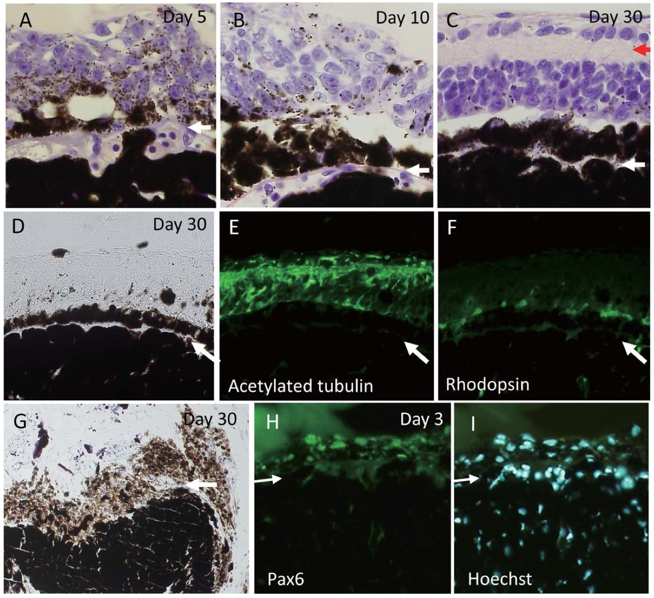 FIG. 6. Regeneration of neural retinal tissues in Matrigel-embedding culture of RPE and choroid after Dispase treatment. A: Day 5, B: Day 10, C: Day 30. In A, the epithelium has grown to form a stratified type of epithelium, and RPE cells facing the Bruchmembrane (arrow) are more densely pigmented. In C, the unpigmented stratified type of epithelium has become separated from the RPE layer, which is on Bruch membrane (arrow). In C, a well-developed layer of cells is observed, and the ganglion cell layer and the inner plexiform layer (red arrow) can be recognized. A: Sections were stained with hematoxylin and eosin. D: are sections neighboring each other. D: transmis- sion image, (E) acetylated tubulin immunocytochemisty, and (F) rhodopsin immunocytochemistry. Arrows indicate the position of Bruch membrane. G: A section of an explant without Dispase treatment. The arrow demarcates RPE cells from the choroid (asterisk). H, I: Pax6 immunocytochemistry in a Matrigel-embedding culture on Day 3. In H, Pax6-positive cells are located at the upper surface of the RPE. The lower cells close to Bruch membrane (indicated by arrows) are negative for Pax6. I: Hoechst staining of the same section.