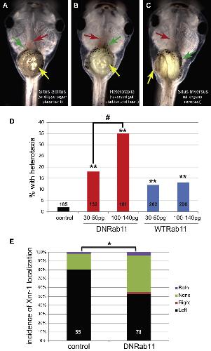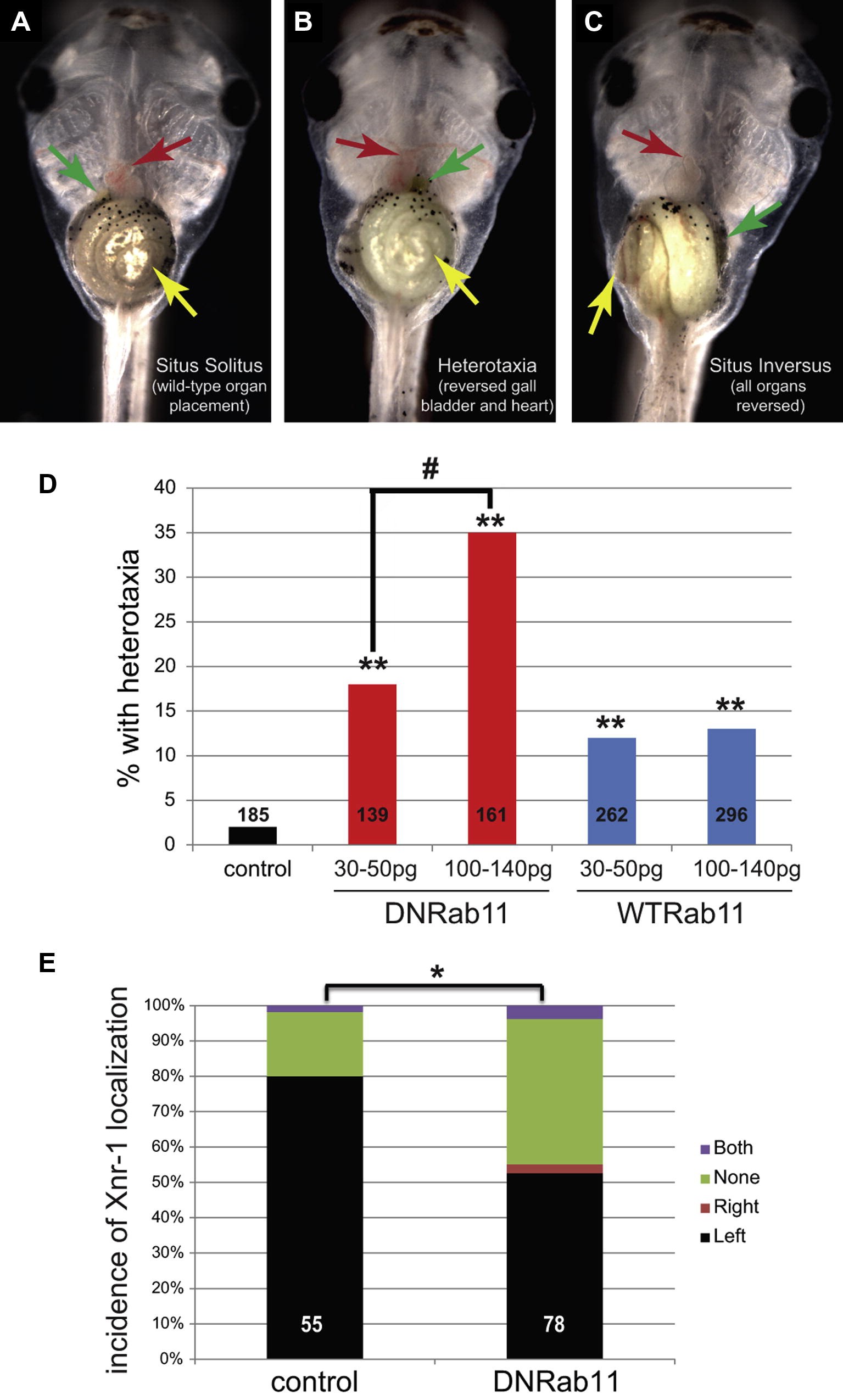 Fig. 1 Alterations in Rab11 function randomize laterality. (A) 1-cell embryos were injected with mRNAs encoding WTor DN Rab constucts and scored at stage 45 based on the situs of three organs: the heart, the gut coil and the gallbladder. (A) Wildtype organ situs (situs solitus) in an untreated embryo. The gut coils to the tadpole left (yellow arrow), the gallbladder is on the right (green arrow), and the heart curves to the left (red arrow). (B) An example of heterotaxic organ situs in an embryo injected at 1-cell with DNRab11, with inverted positioning of the heart and gallbladder. The gut is positioned properly. (C) Embryo with situs inversus, a form of heterotaxia where the position of all three organs is reversed, after 1-cell injection of DNRab11. (D) Embryos injected with various doses of either DNRab11 or WT Rab11 at 1-cell displayed significantly increased rates of heterotaxia. For all graphs, numbers on bars indicate sample size. **p < 0.001 relative to uninjected controls (X2 test), #p < 0.001 comparing treated groups (X2 test). (E) Embryos injected at 1-cell with DNRab11 were scored for Nodal (Xnr-1) mRNA localization at stage 21. Left-sided Nodal expression was significantly decreased in DNRab11 injected embryos compared to controls. *p < 0.01 relative to uninjected controls (X2 test). |