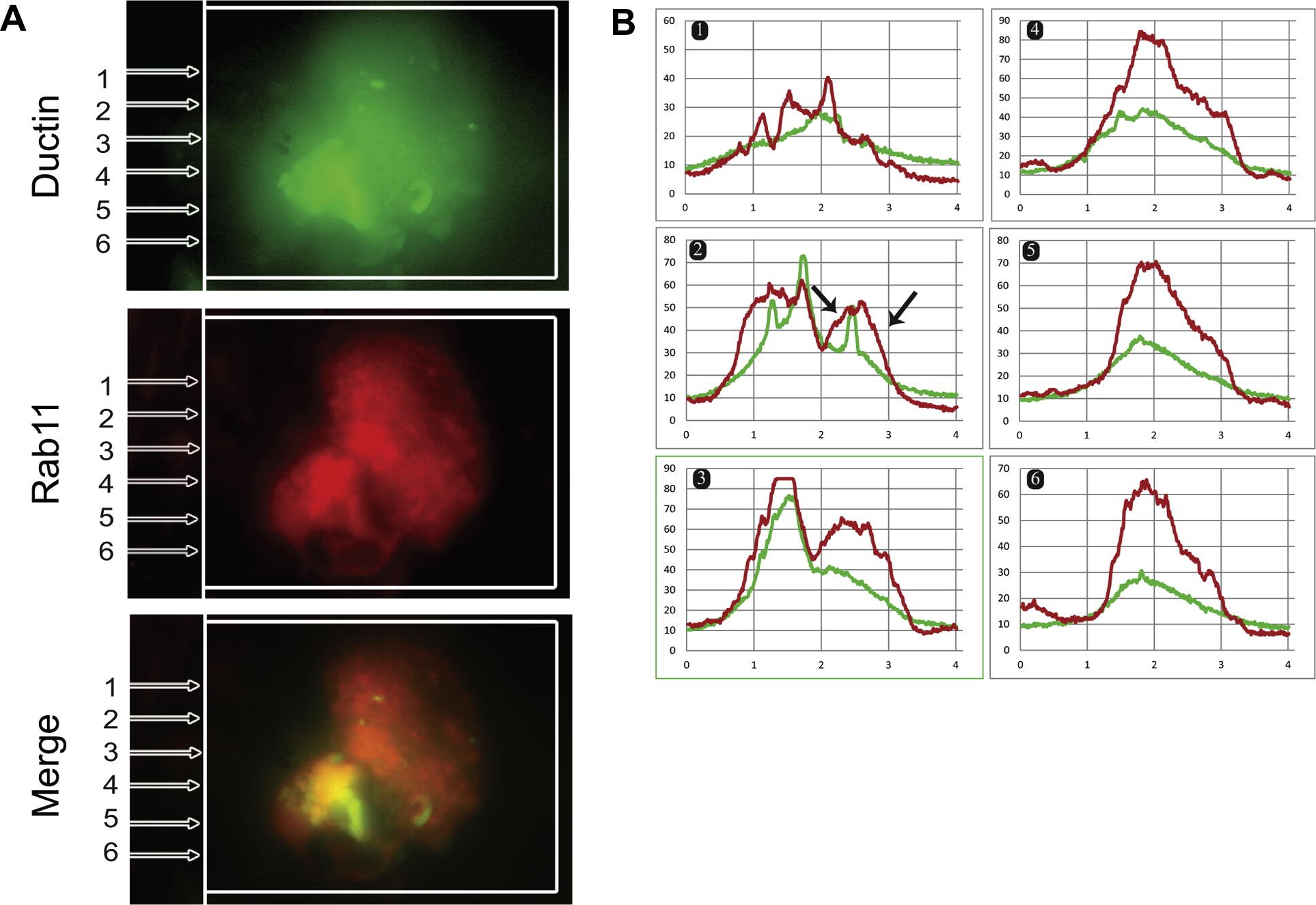 Fig. 5 Rab11 and ductin have a close intracellular localization. Embryoswere injected at the 1-cell stage with Rab11-Tom and Ductin-YFP. At stage 45, cells fromthe tail expressing both constructswere viewed at 100magnification. Whenever possible, single cells or a small cluster of cells with tomato and YFP signal were examined. (A) DuctinFP (shown in green), Rab11 Tom (shown in red) and a merged image (with overlapping regions indicated in yellow) were examined. Z stacks were analyzed for intensity with the plot profile feature in ImageJ along the six lines indicated (representative of different regions within the cells). (B) Quantitative plots of Rab11om (red) and DuctinFP (green) expression corresponding to each region of the cells (indicated by lines in panel A). Regions of high intensities of DuctinFP and Rab11om expression were found to overlap. Furthermore, strong Rab11-Tom expression was often found surrounding strong ductin expression, as indicated by the arrows in plot 2. |