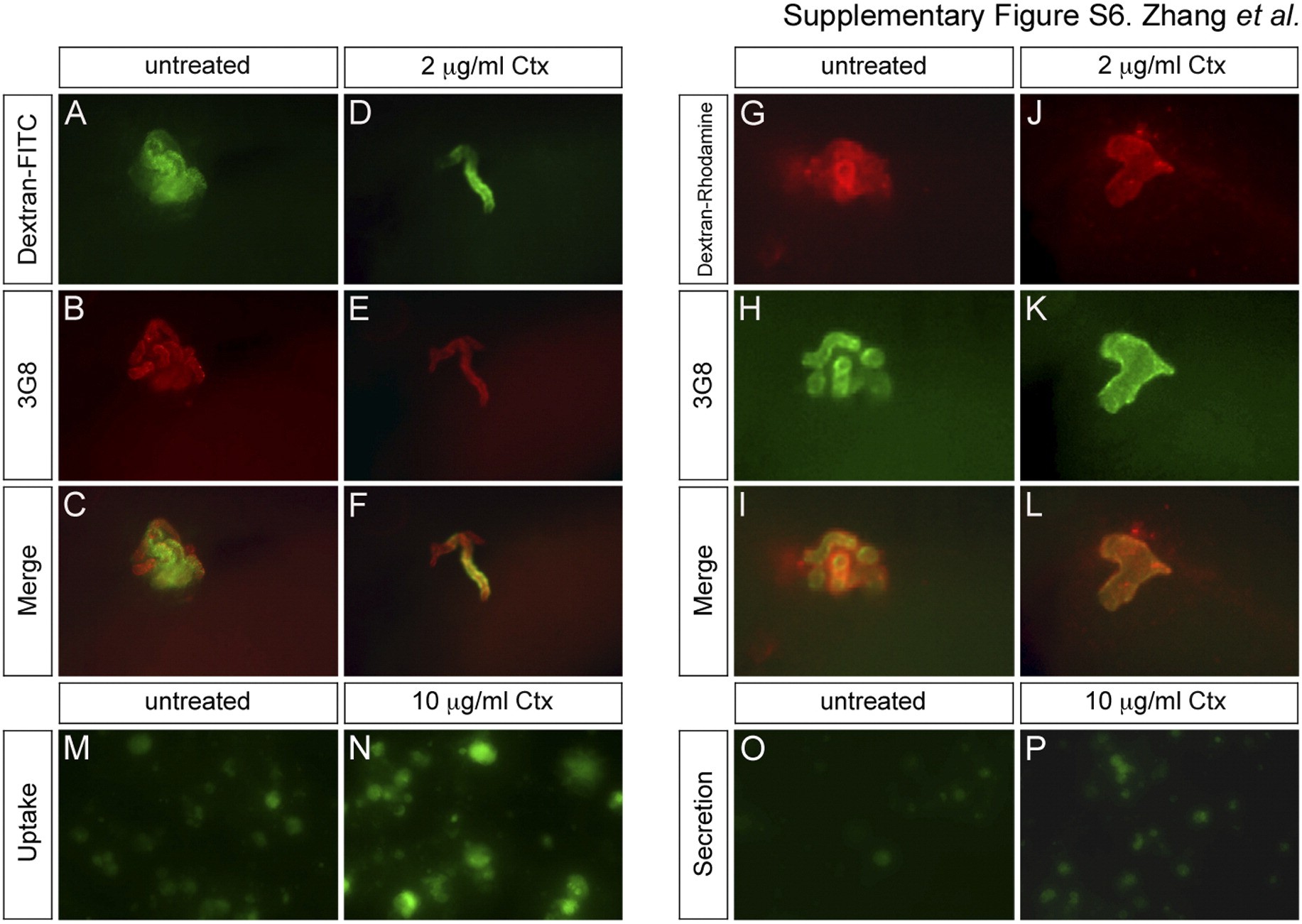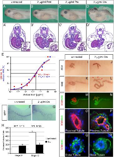 Supplementary Fig. S6. Uptake and secretion assays in Xenopus and human HK-2 cells. (A�L) Untreated or Ctx-treated Xenopus embryos were injected with 10 kD Dextran-FITC (A�F) or 150 kD Dextran�Rhodamine (G�L) at stage 35. Embryos were fixed at stage 40, stained with 3G8 and examined for retention of Dextran in the proximal tubules. (M�P) Representative fluorescence microscopy images of the Albumin-FITC uptake and secretion assays described in Fig. 5E and H.