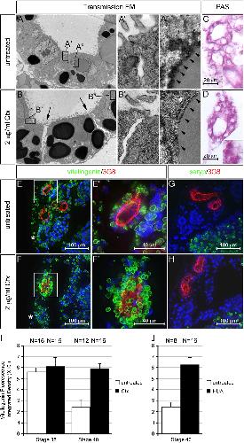 Fig. 2. Interfering with proximal tubular growth caused a defect in yolk platelet degradation. (A to B″) Xenopus embryos were treated with 2 μg/ml Ctx at stage 29/30 and analyzed at stage 42 using transmission electron microscopy at a 2650-fold (A and B) or 31,000-fold magnification (A′, A″, B′ and B″). Position of the insets is indicated by the black boxes in (A and B). Arrows indicate the gaps between the proximal tubular cells upon Ctx treatment, arrowheads point towards the membrane layer surrounding the degrading yolk platelets. (C and D) PAS staining to visualize protein-rich granules in the proximal tubules. Inset shows close-up of a single cell. (E and H) Immunofluorescence staining of proximal tubules using 3G8 (red), anti-vitellogenin or anti-seryp antibodies (green). (E′ and F′) are close-ups of the proximal tubules indicated by white boxes in (E and F); the asterisks indicate the distal tubules; nuclei were counterstained with DAPI (blue). (I and J) Quantification of anti-vitellogenin staining for untreated and Ctx treated embryos at stage 35 and 40 (I) as well as untreated and treated with Hydroxyurea/Aphidicolin (HUA) at stage 40 (J).